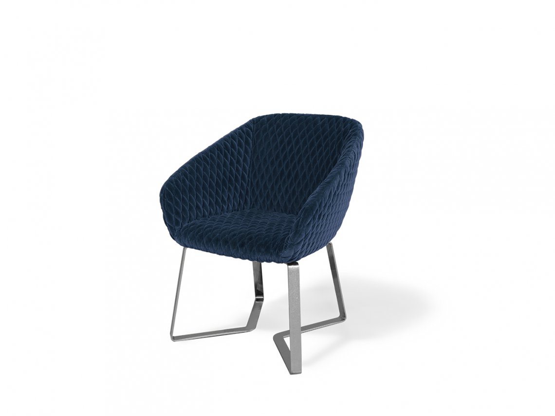 The armchair Oliver is a piece that recalls the style of the 50s. The whole seat is wrapped in a diamond-shaped quilting that gives the surface a three-dimensional light-and-dark effect. The structure supporting the seat is made up of two metal ribbons which, embellished by hand-made sculptural work, create a pleasant geometric effect. This armchair is customizable with upholstery in leather or fabric as well as in the chromatic metal finishes.