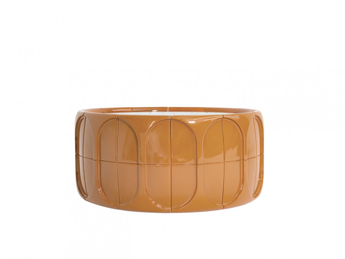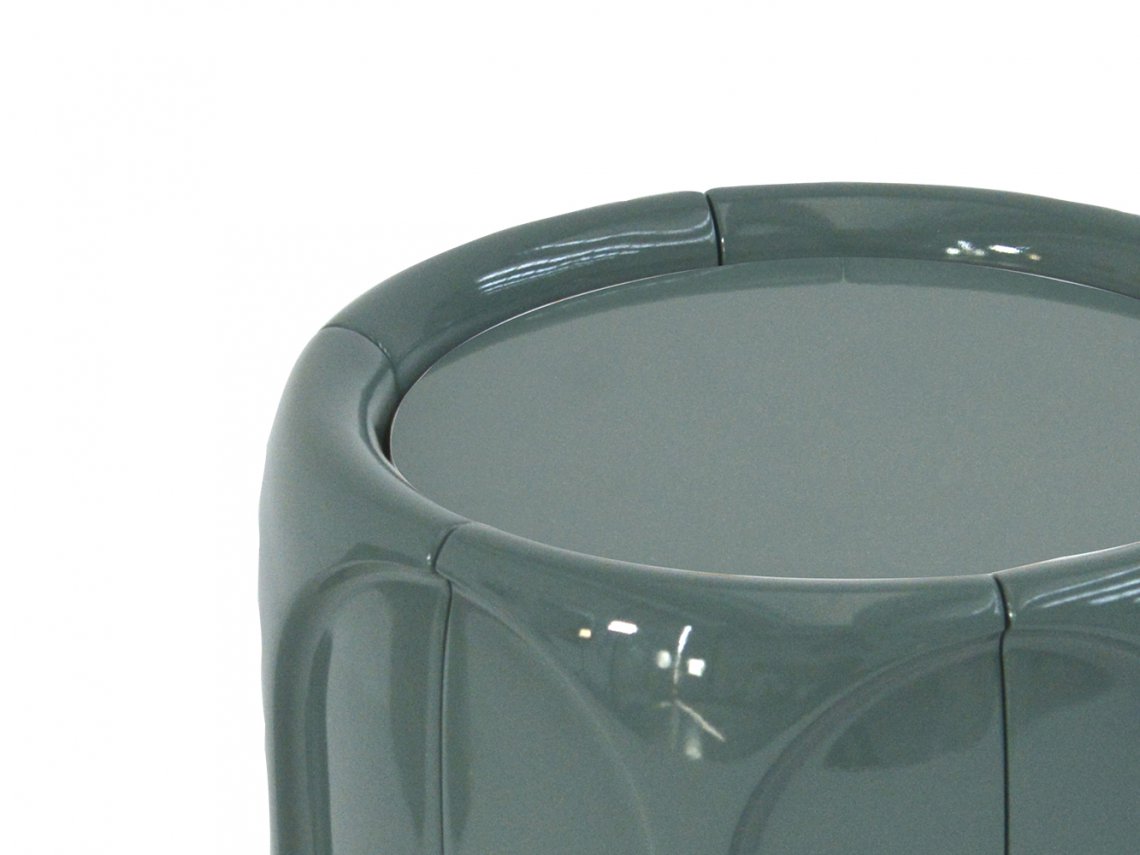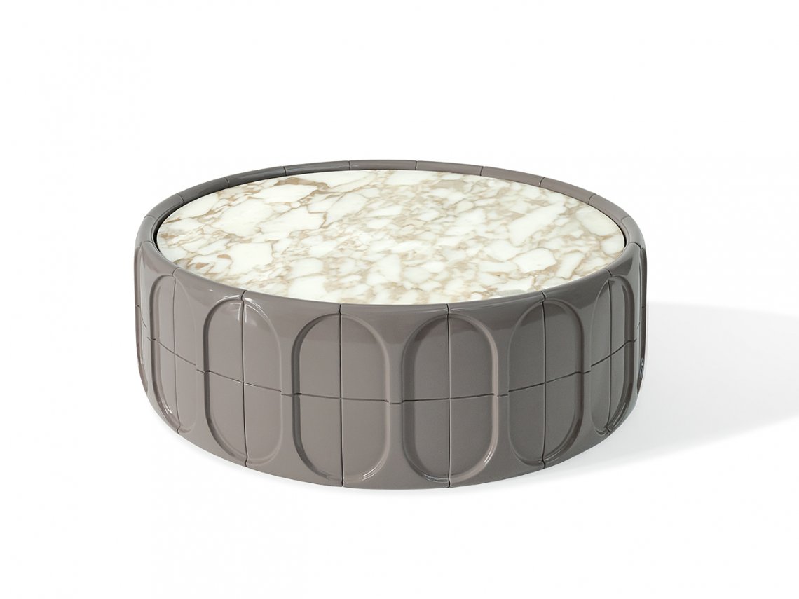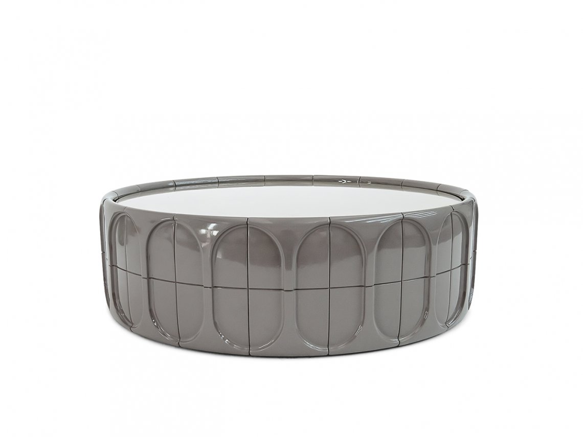 Concave coffee table enriches the living area with a sculptural touch and is characterized by a round shape embellished on the surface by many three-dimensional facets, inspired by the columns of the Roman era. It is available in various colours with a glossy or matt finish.
