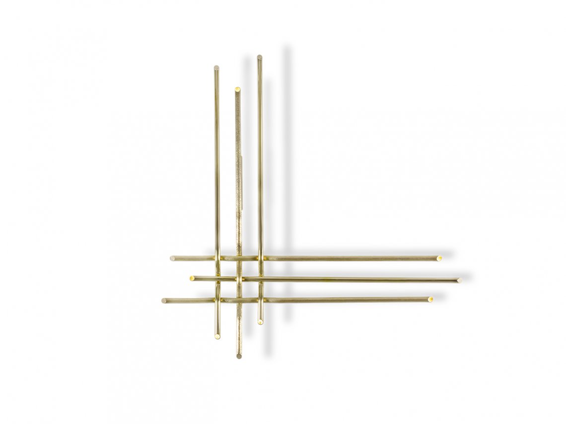 The wall lamp Macrame is a twist of metal pipes. Blades of light spread from some of them decorating the wall of the living area with minimal elegance. The metal chosen for this wall lamp is brass with shiny gold and sculpture details finish emphasized by the light reflections of the environment.