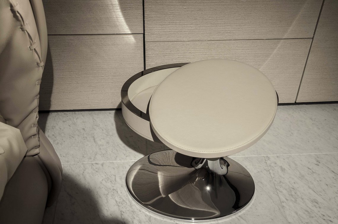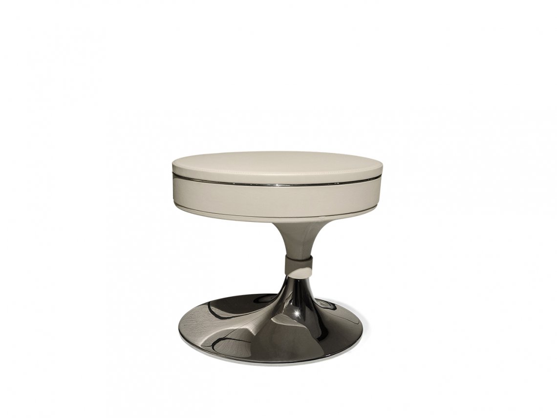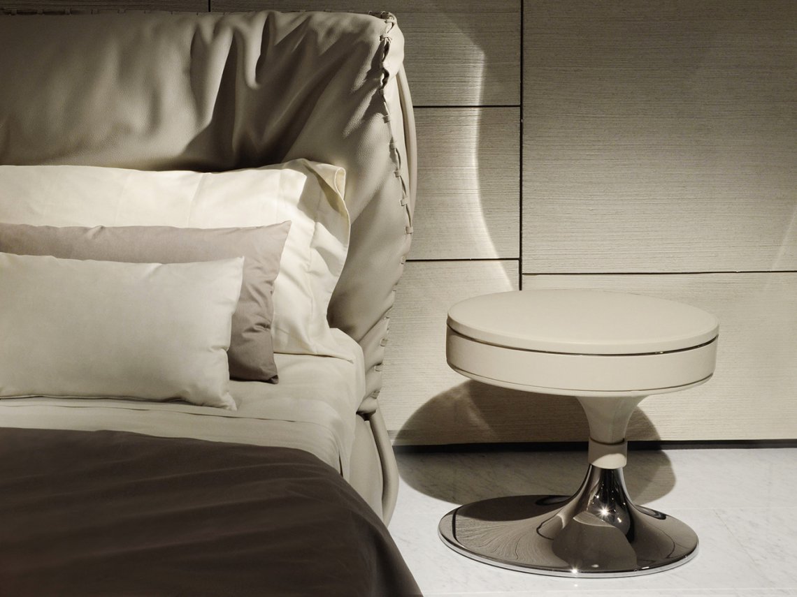 The night table Donald has an “oval trumpet shape” structure with a small storage compartment in the upper part accessible with a rotation of the top. Externally, the night table is completely covered with sartorially tooled leather with double-stitched seams that enhance the wedge-shaped design of the upholstery. With a simple but elegant shape this night table is particularly suitable for a sleeping area. It is available in one size.