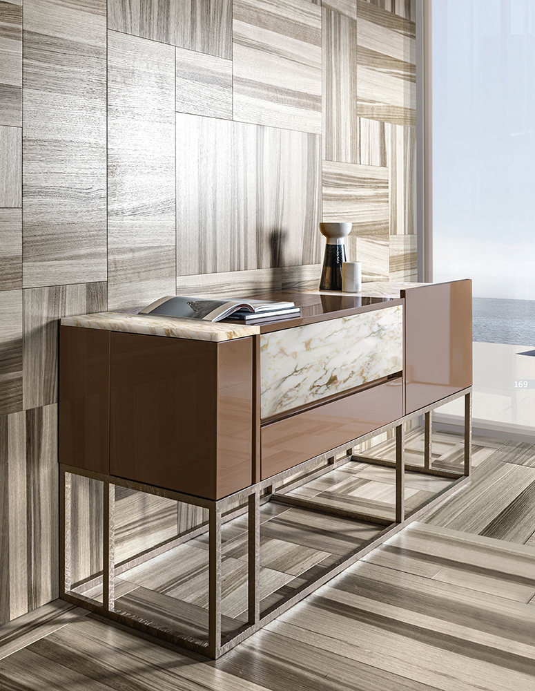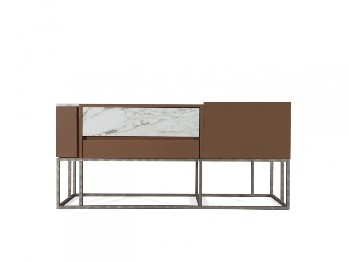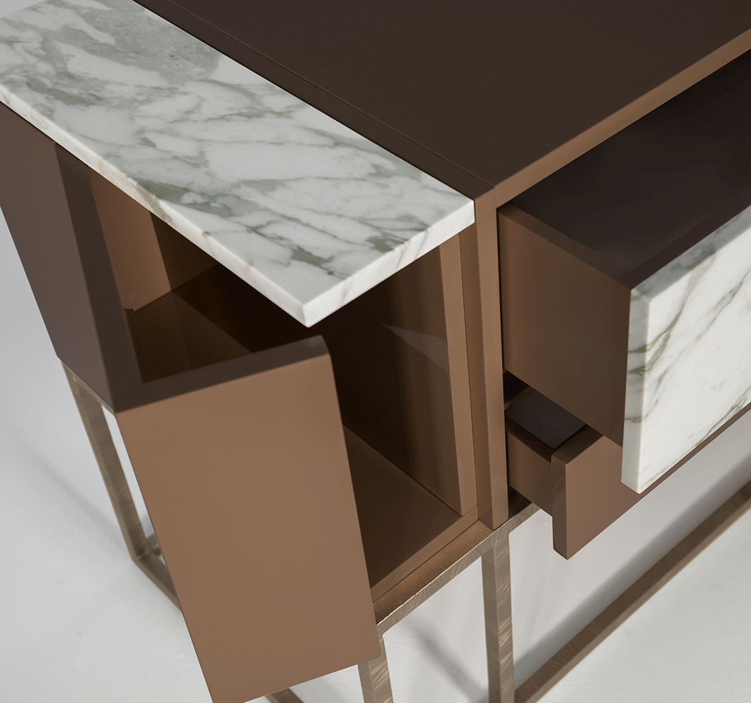 A continuous sequence of right angles defines the shape of Lineup chest. The design and proportions are the result of research inspired by the art movement ”De Stijl”, also known as neoplasticism, which is expressed by basic and geometric lines. The skillful manual method of engraving on the metal base is inspired by the working techniques of Italian premium class jewelry. In the door, in the drawers and on the top,marbles and pastel colours finished are combined in perfect harmony.
