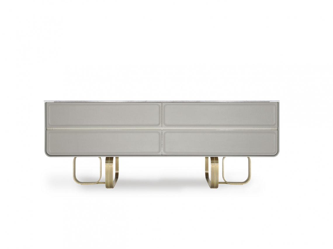 The drawer unit Nova with drawers and rounded shape can be considered the protagonist of the bedroom. The care to details is visible on the drawers decorated with three-dimensional frames upholstered with soft leather. The structure is supported by two metal bases that characterize the collection while the internal sides are made up of eucalyptus wood.