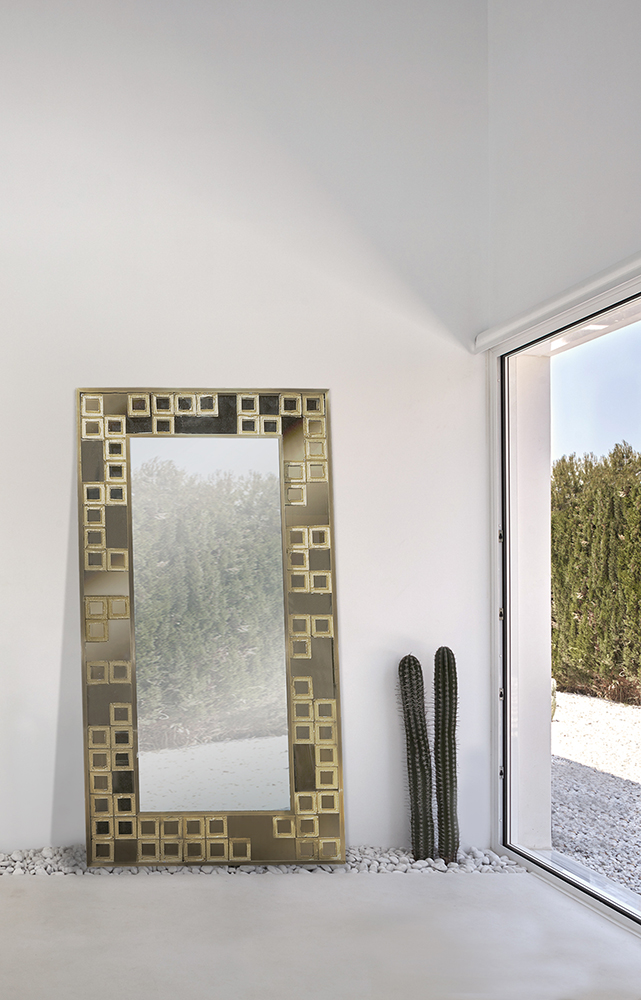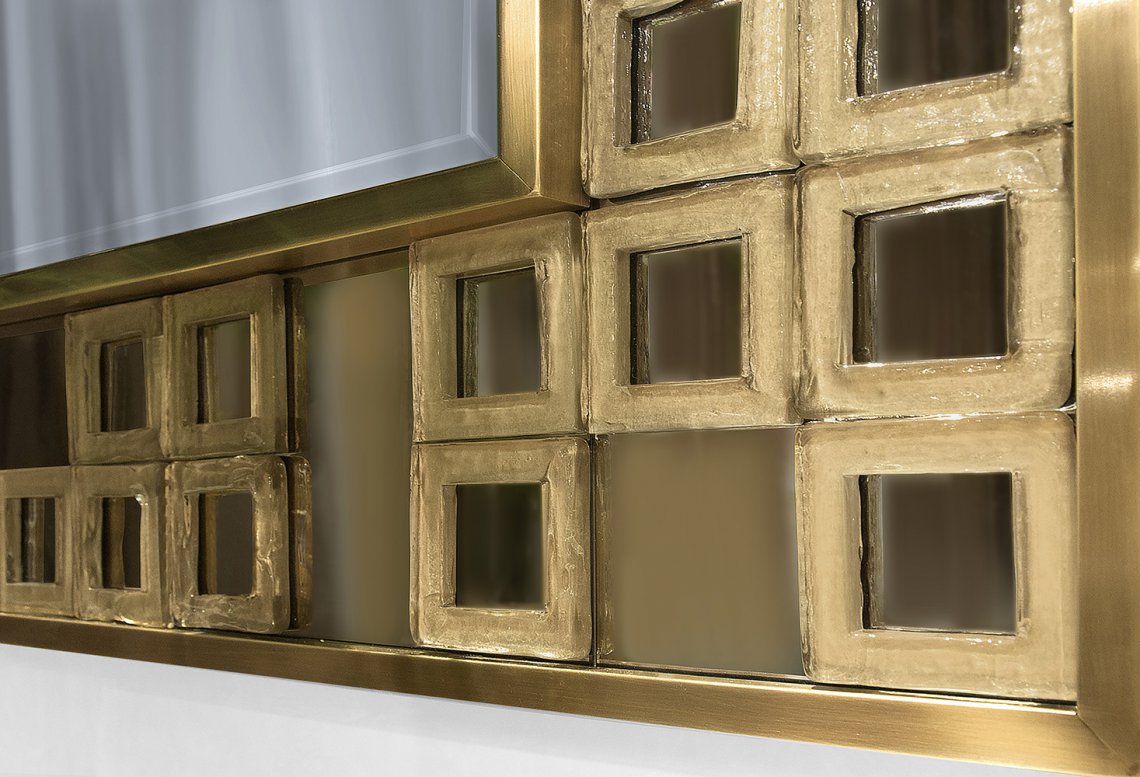Mirror Katherine has a geometrical shape with many details: its frame is decorated with handmade precious glass elements realized one by one by master glassmakers in Venice area. The alternation of glass details applied onto the frame suggests a refined geometrical look and the sophisticated golden shade behind each square element exalts the beauty of the casted-in plates glass. This precious and sophisticated mirror suits to different styles and environments.