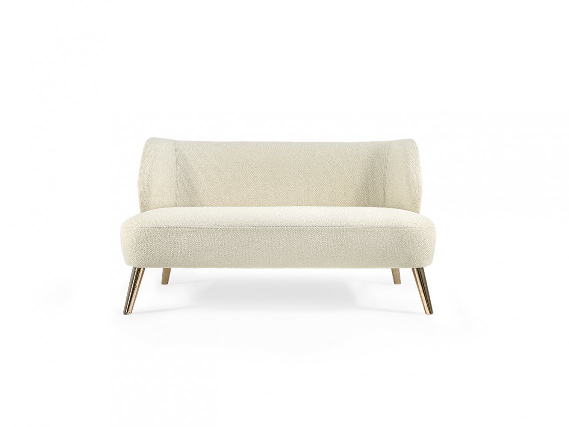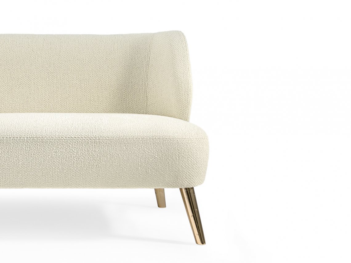 The enveloping and comfortable sofa Marilou can be upholstered only with selected textured fabrics. The backside is characterized by a quilting embroidered with hexagonal design. The bronze metal feet are realized with the ancient sand casting technique that conveys an artistic touch to the sofa.