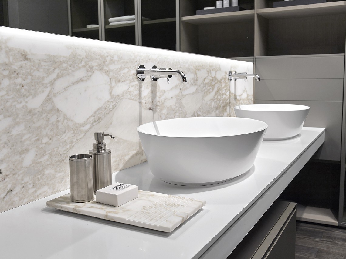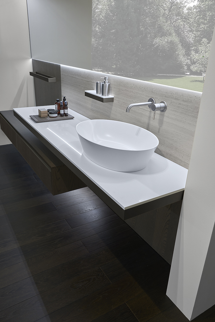 Lavabi da appoggio in Monolith, senza troppo pieno, con tappo piletta in Monolith.