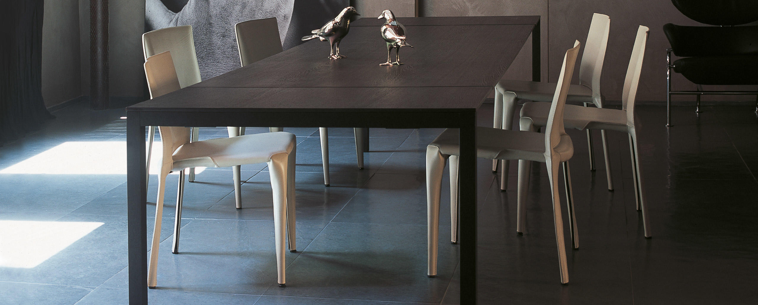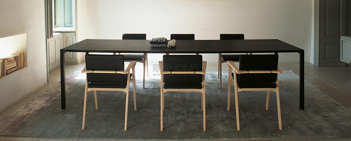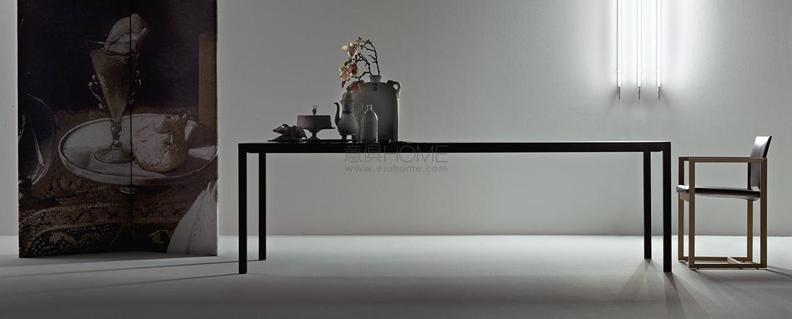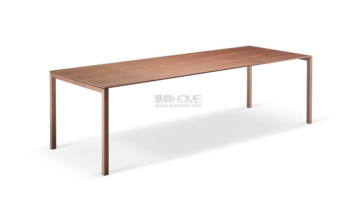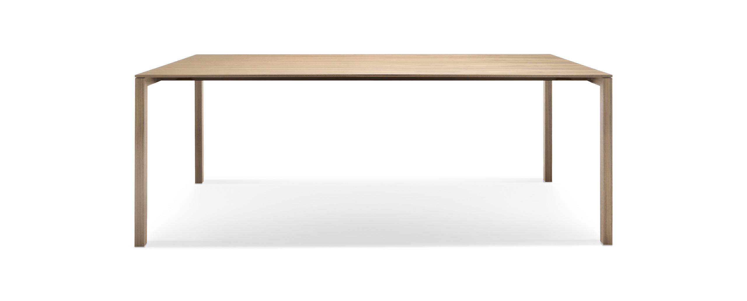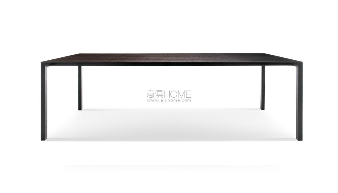 Piero Lissoni disegna questo tavolo applicando una duplice lettura basata sulla leggerezza visiva e sulla solidità strutturale dell’oggetto. Il rigore formale è accentuato dallo spessore ridotto del piano rettangolare di soli 10 mm, realizzato in d iverse finiture tra cui la versione in rovere fumigato che, grazie a una lavorazione innovativa, valorizza l’essenza del legno