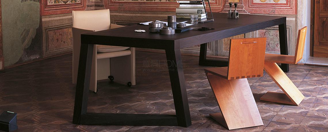 Piero Lissoni definisce questo tavolo-scultura come “un arredo dalla personalità diversa e spiazzante”, racchiusa in una combinazione asimmetrica di tanti pezzi diversi. Il tratto lineare dei sostegni e del piano si piega dinamicamente nei giunti per creare direzioni opposte di rotazione. Le sapienti deformazioni sono visibili solo attraverso una visione a 360° che consente di percepire appieno il tratto enigmatico del mobile. La raffinatezza del massiccio piano rettangolare rievoca la matrice asimmetrica nella composizione delle lastre di rivestimento, rifinite con un particolare intarsio materico che accentua la lavorazione fumigata del legno. Gli accorgimenti costruttivi ed estetici traducono l’eccellenza artigianale di Cassina mettendo in luce lo studio meticoloso compiuto sui giunti e sugli snodi tra gli elementi di forma irregolare.