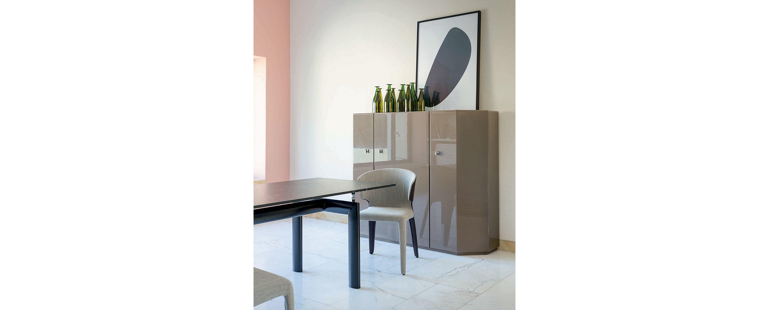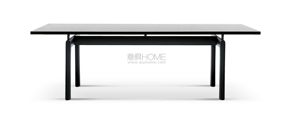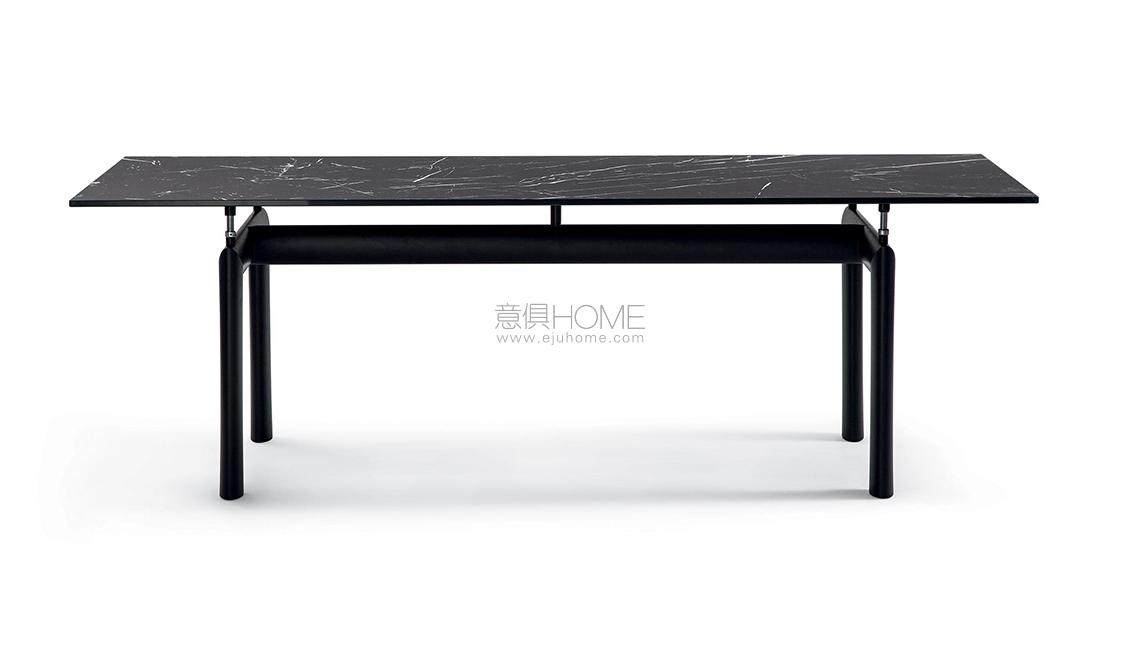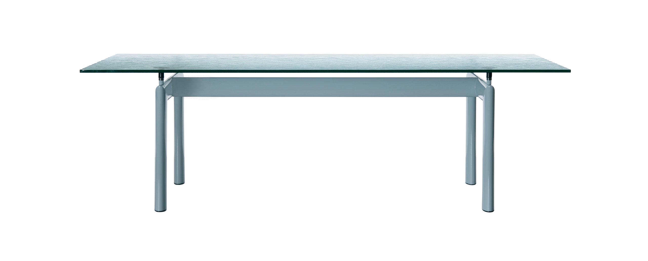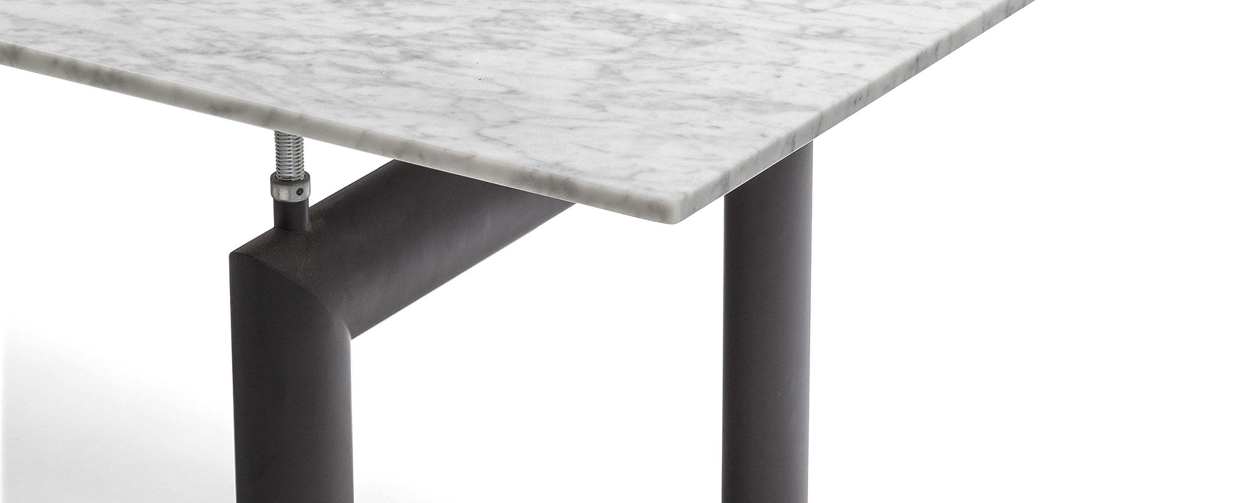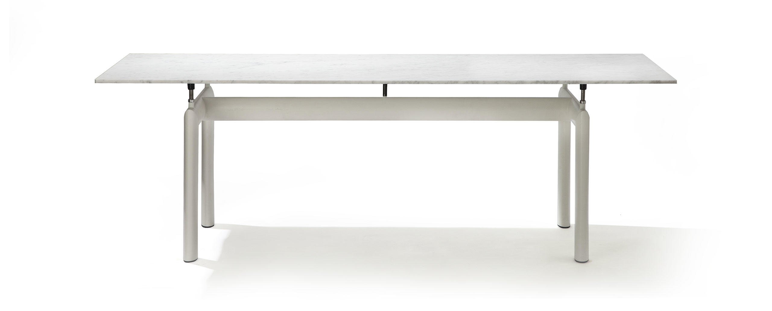 L’idea di base del tavolo LC6, presentato nel 1929 al Salon D’Automne, risiede nella distinzione tra l’elemento portante e l’elemento portato, ovvero tra il basamento e il piano. L’autonomia delle due parti è evidenziata da quattro sostegni intermedi che fungono sia da regolatori di livello che da distanziatori tra la consistenza del supporto e le linee esili del piano. In particolare, il basamento fu disegnato nel 1928 facendo riferimento i profili ovoidali impiegati nel settore aereonautico per separare le ali dei biplani. Il modello attuale presenta il basamento in acciaio verniciato nei colori della palette di Le Corbusier, con piano disponibile in cristallo, vetro stampato, legno, o nelle pregiate finiture in marmo bianco Carrara e marmo nero Marqui?a.