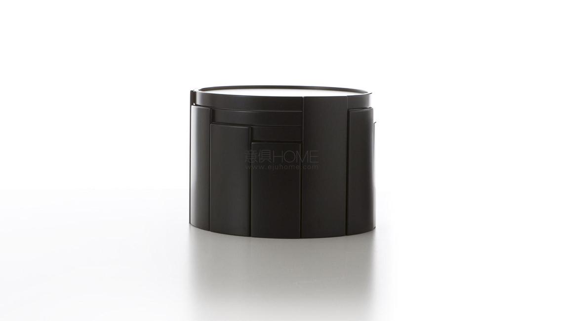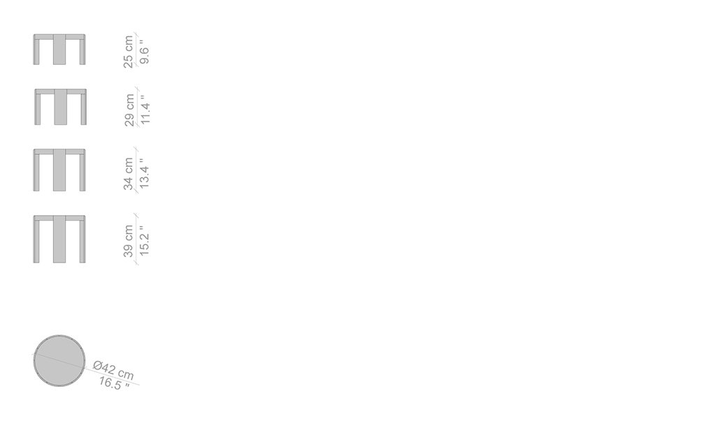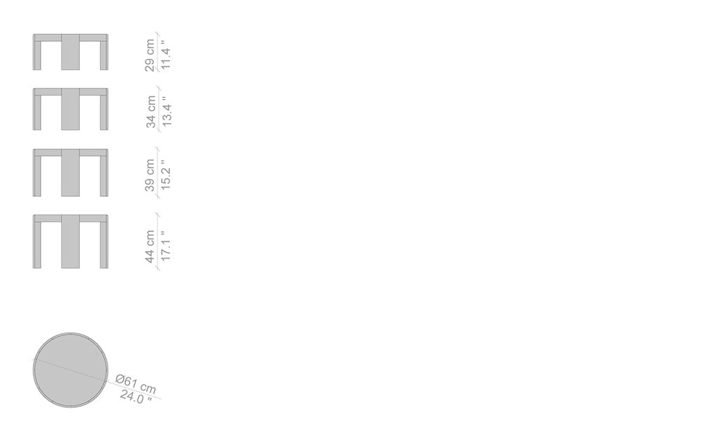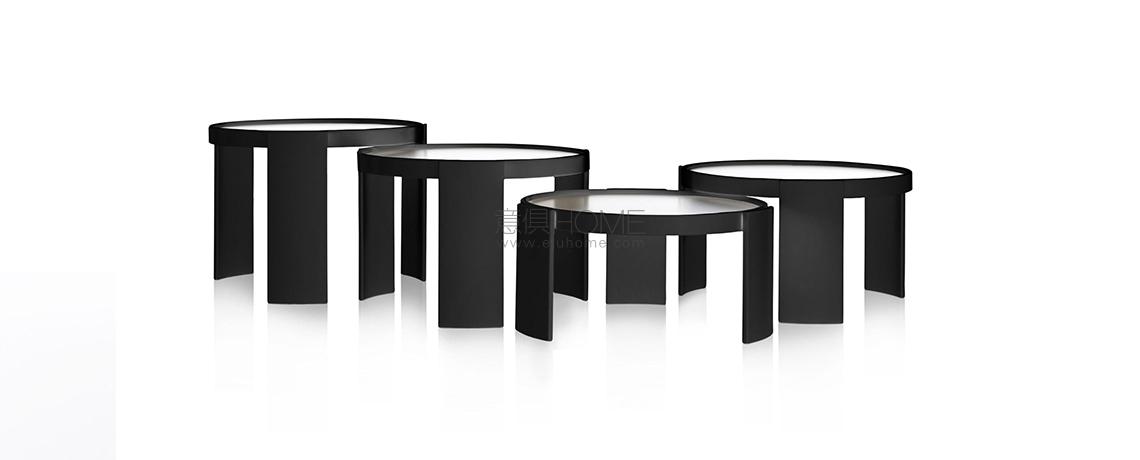 Una serie che diventa emblema del design degli anni ’60, epoca fortemente orientata all’ottimismo e alla sperimentazione nell’ottica della ricerca della funzionalità assoluta. La proposta ideata da Gianfranco Frattini comprende quattro tavolini bassi, da 42 a 60 centimetri di diametro, caratterizzati da altezze decrescenti impilabili tra loro in una forma unica e compatta, che con il suo effetto scultoreo ricorda la sagoma di un tamburo. La struttura in faggio tinto noce o in faggio laccato nero è dotata di un ripiano in laminato plastico naturale dal design monocromo e reversibile. Quando il ripiano viene sollevato rivela il colore diverso della parte sottostante, laccata bianca o laccata nera. Il modello, oggi come allora, è particolarmente apprezzato per la grande versatilità permessa dalla sovrapposizione.