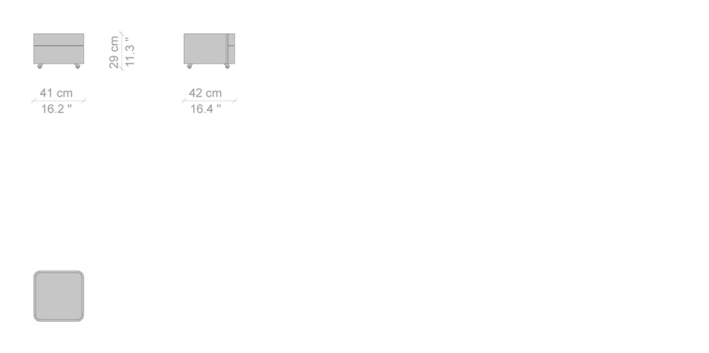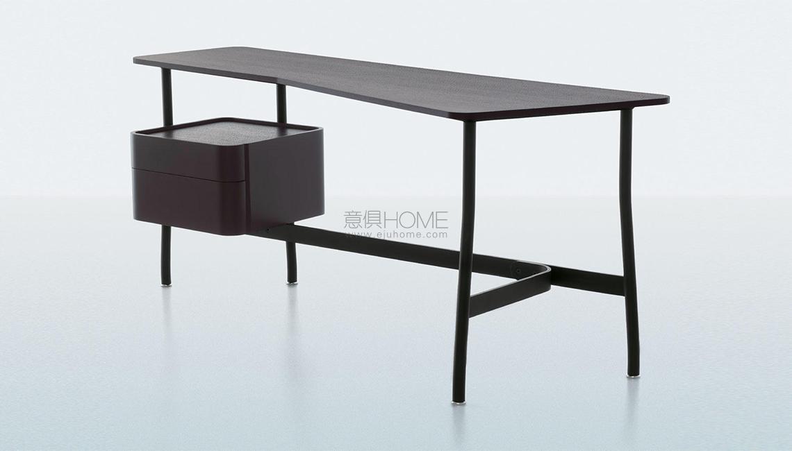Comodino in legno tinto nero, a uno o due cassetti, con rotelle pivotanti; scrittoio in rovere tinto scuro con piano sagomato sinistro o destro e cassettiera in legno tinto nero sinistra o destra, con cassetto dotato di vassoio interno.