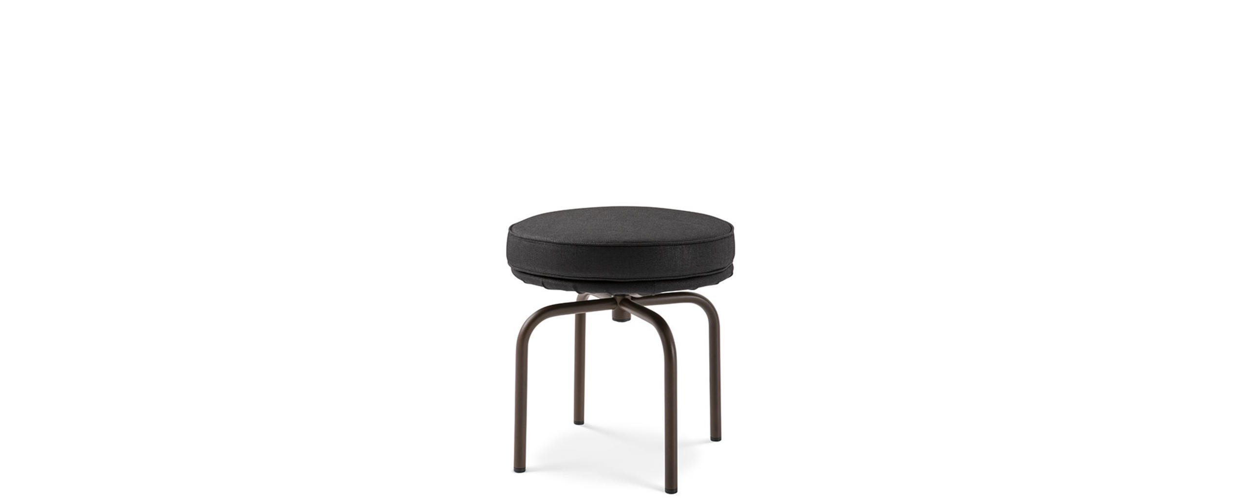 Lo sgabello LC8 trae ispirazione dalla poltroncina girevole disegnata nel 1927 da Charlotte Perriand per il suo appartamento di Place Saint-Sulpice a Parigi, anch’esso parte del programma di arredi esposto al Salon d’Automne nel 1929. La sua forma iconica e versatile, inserita alla collezione co-firmata con Le Corbusier e Pierre Jeanneret, risponde alla volontà di razionalizzare la produzione in serie utilizzano elementi comuni. La struttura in acciaio cromato trivalente, lucido o verniciato, presenta un’imbottitura in ovatta di poliestere e poliuretano espanso schiumato privo di CFC, con rivestimento in pelle o tessuto. Lo sgabello, disponibile anche nella versione outdoor con struttura in acciaio inossidabile verniciato con vernici a polvere specifiche per esterno in 5 colori goffrati, ha ottenuto le certificazioni Catas grazie all’aggiornamento strutturale compiuto da Cassina nel 2016.