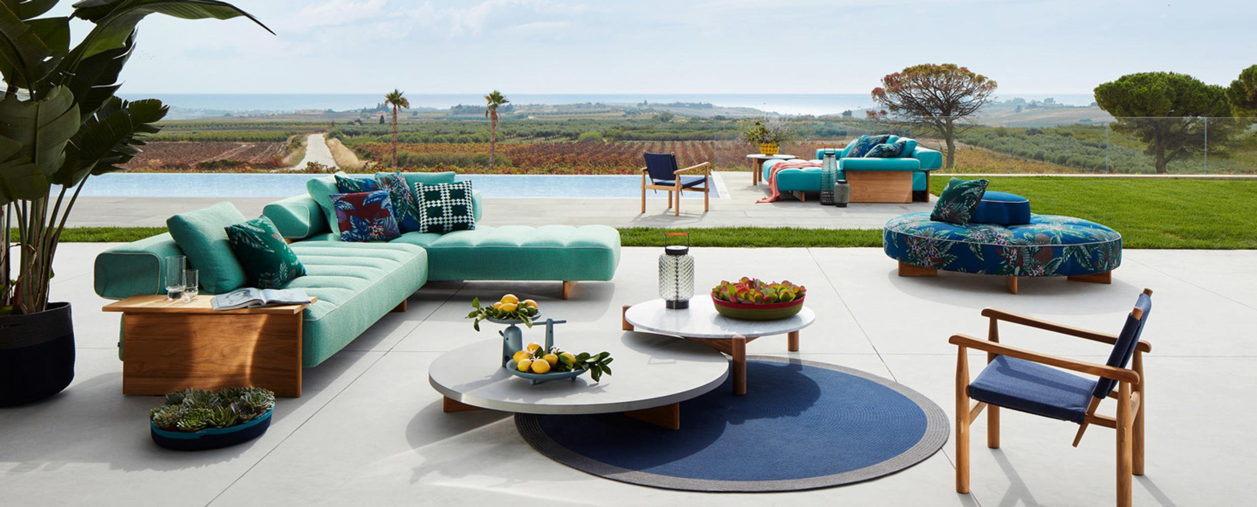 Il tavolino basso della collezione Sail Out, disegnata da Rodolfo Dordoni, è disponibile con piano in terrazzo giallo-bianco o verde-bianco o in cemento ed è sorretto da piedini in massello di teak. Completa la famiglia un divano componibile in tre moduli e tre elementi e un pouf in due misure.