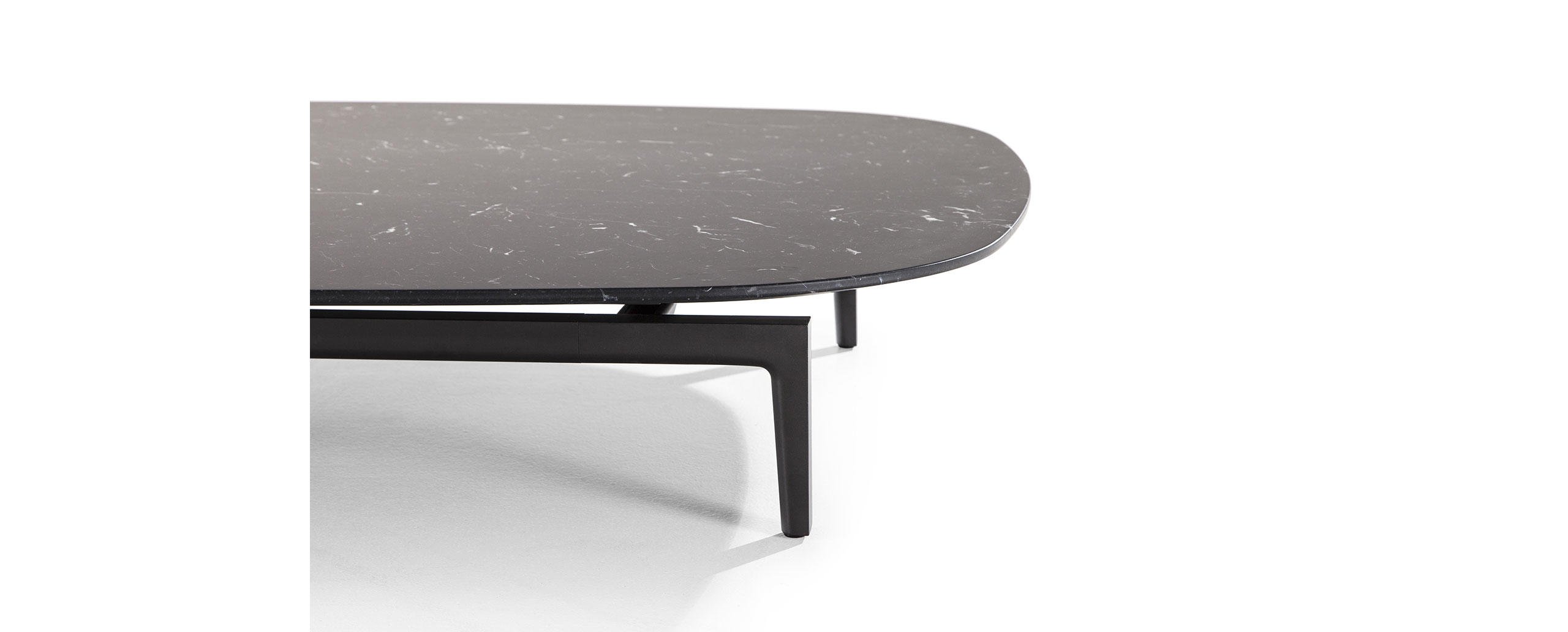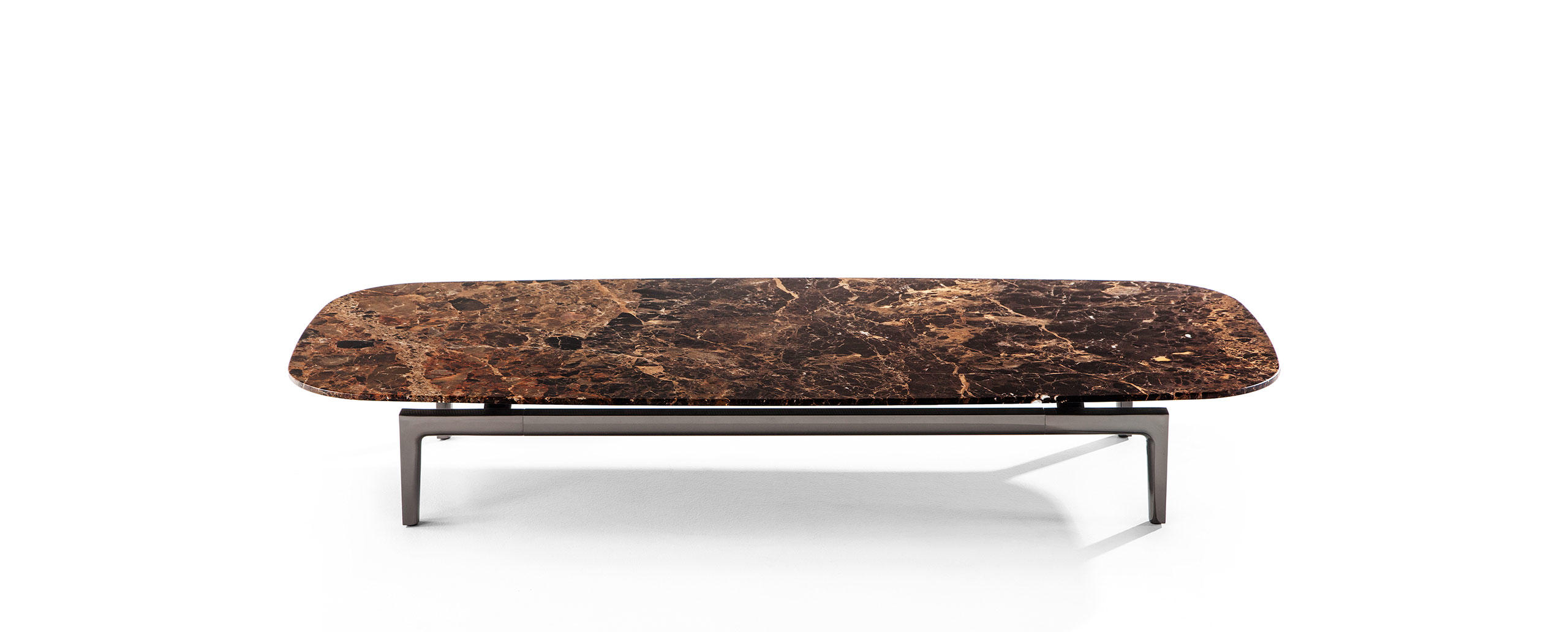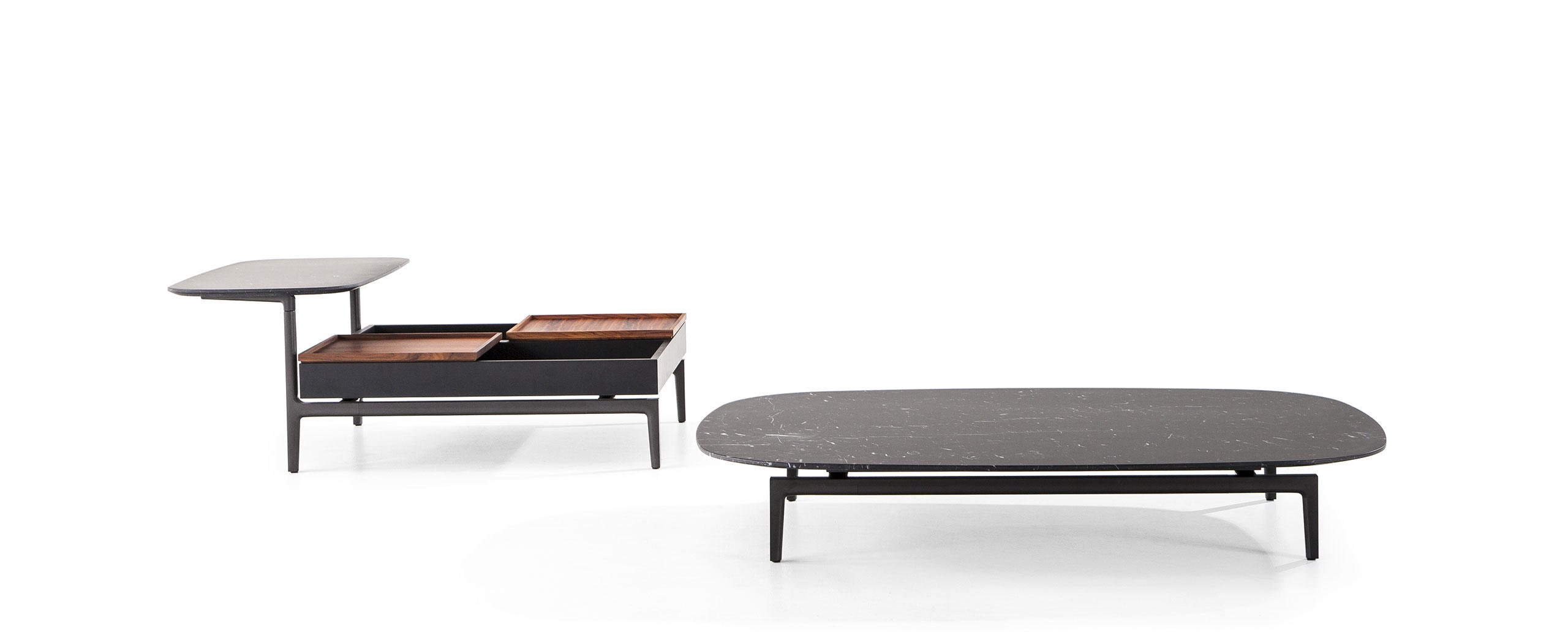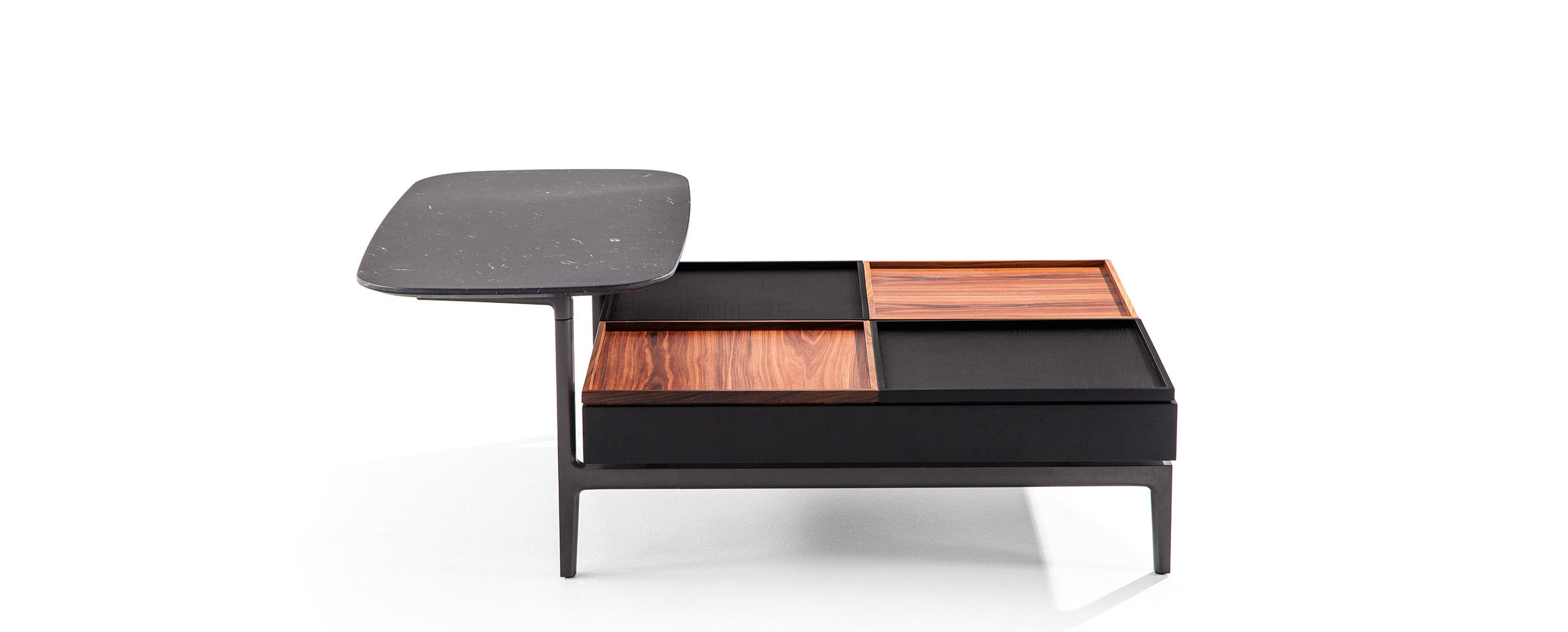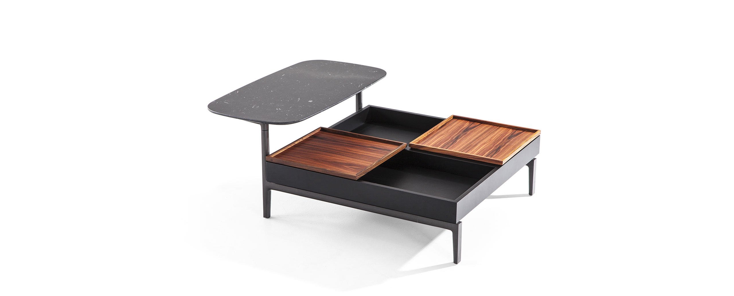 E’ inoltre presente un tavolino a due livelli con un ripiano superiore posizionato lateralmente e un contenitore più basso su cui poggiano due vassoi di legno lavorati a mano. Il tavolino è proposto in un’ampia varietà di marmi tra cui il bianco Carrara, il nero Marquinia e il grigio Carnico o Emperador, mentre la base in alluminio è caratterizzata dalle stesse finiture dell’omonimo divano ovvero antracite lucido, opaco o canna di fucile. I vassoi di legno sono disponibili in palissandro santos o in rovere tinto nero.