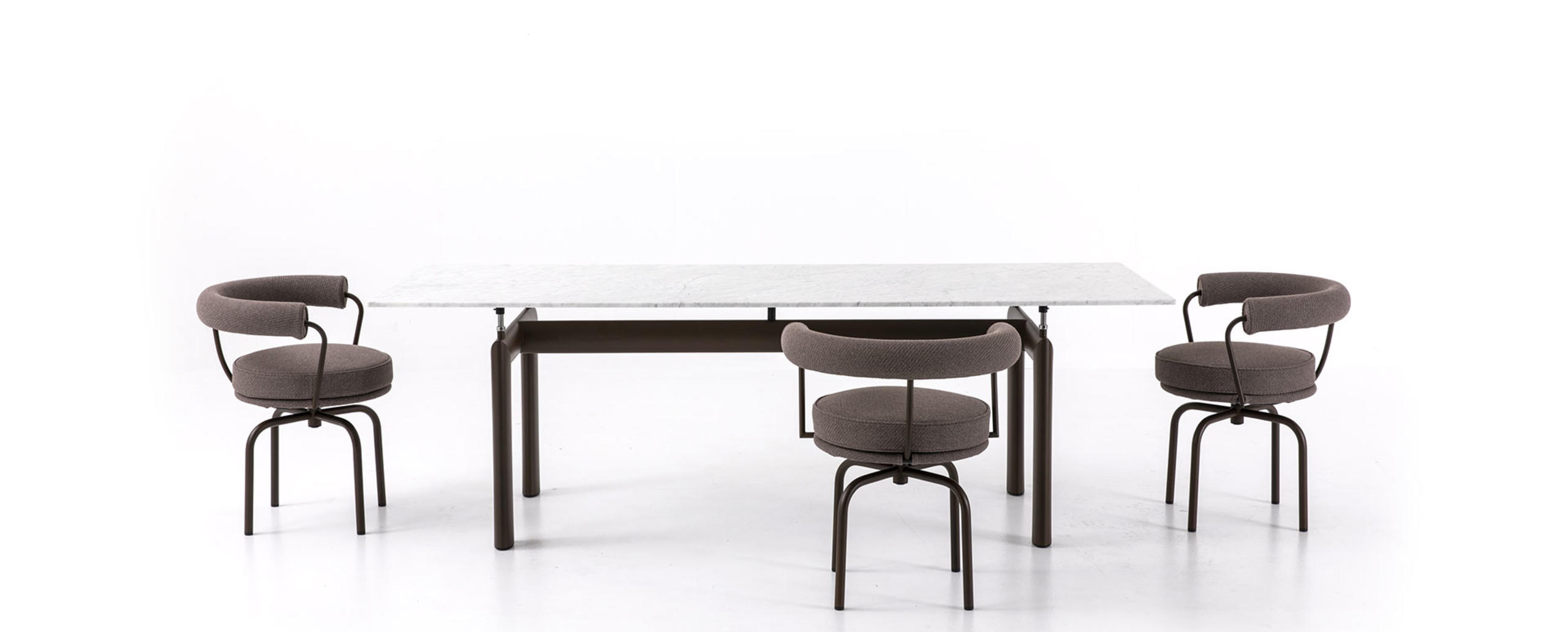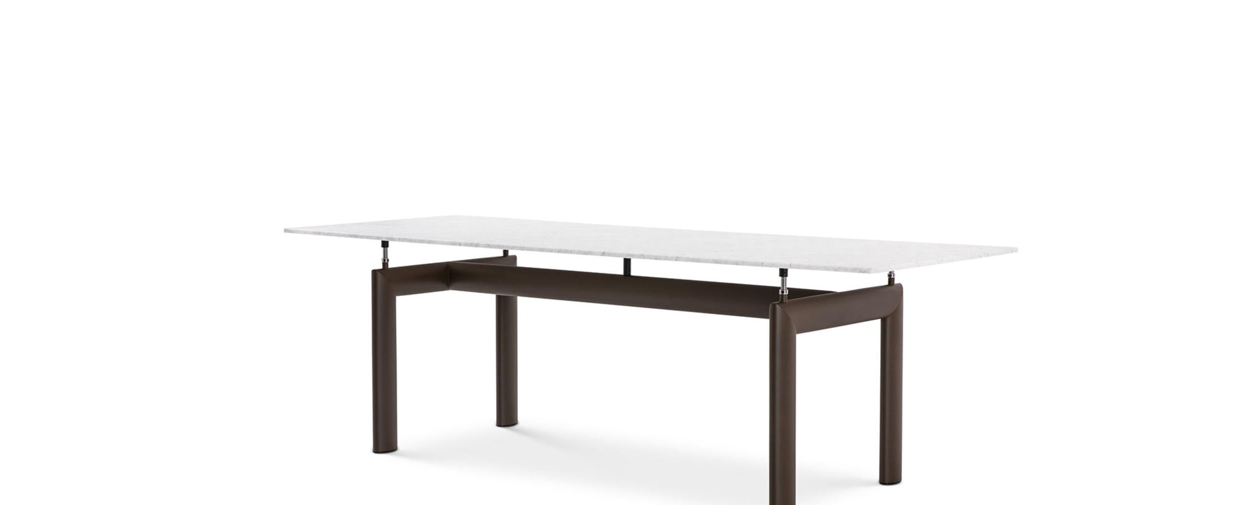 L’idea di base del tavolo LC6, presentato nel 1929 al Salon D’Automne, risiede nella distinzione tra l’elemento portante e l’elemento portato, ovvero tra il basamento e il piano. L’autonomia delle due parti è evidenziata da quattro sostegni intermedi che fungono sia da regolatori di livello che da distanziatori tra la consistenza del supporto e le linee esili del piano. In particolare, il basamento fu disegnato nel 1928 facendo riferimento i profili ovoidali impiegati nel settore aereonautico per separare le ali dei biplani. Il modello attuale presenta anche una versione outdoor con struttura in acciaio inossidabile verniciato con vernici a polvere specifiche per esterno in 5 colori goffrati.