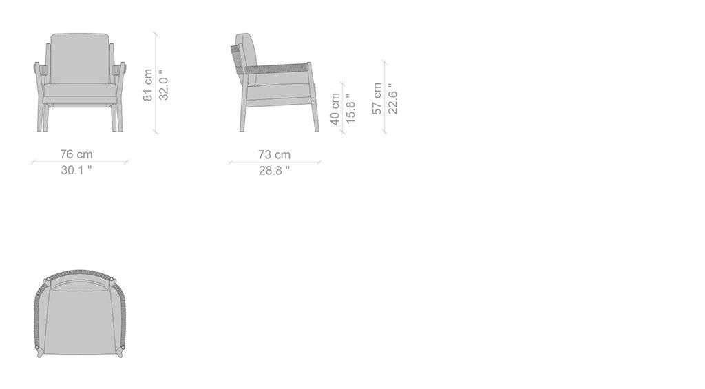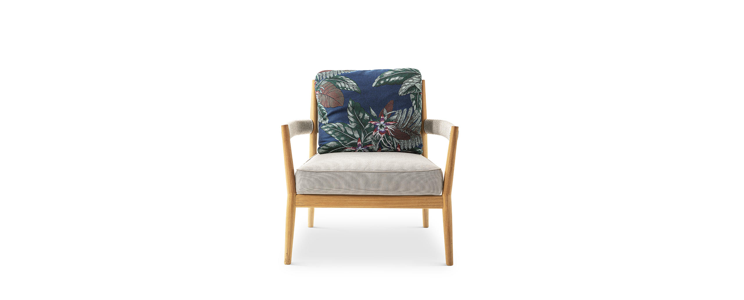 Con dettagli curati e forme accoglienti, la poltroncina impilabile Dine Out ha una struttura in massello di teak impreziosita da una corda in polipropilene grigio intrecciata a mano intorno ai braccioli e alla parte superiore dello schienale. La comodità della seduta è data da un cuscino in ovatta con un inserto in poliuretano espanso, fissato con due fasce sulle doghe in massello di teak lasciando a vista il telaio in legno, e arricchito da un profilo in gros-grain grigio sul bordo superiore. Il cuscino dello schienale è a saponetta con una doppia cucitura e angoli raggiati. Tutte le parti imbottite sono rivestite da tela idrorepellente.