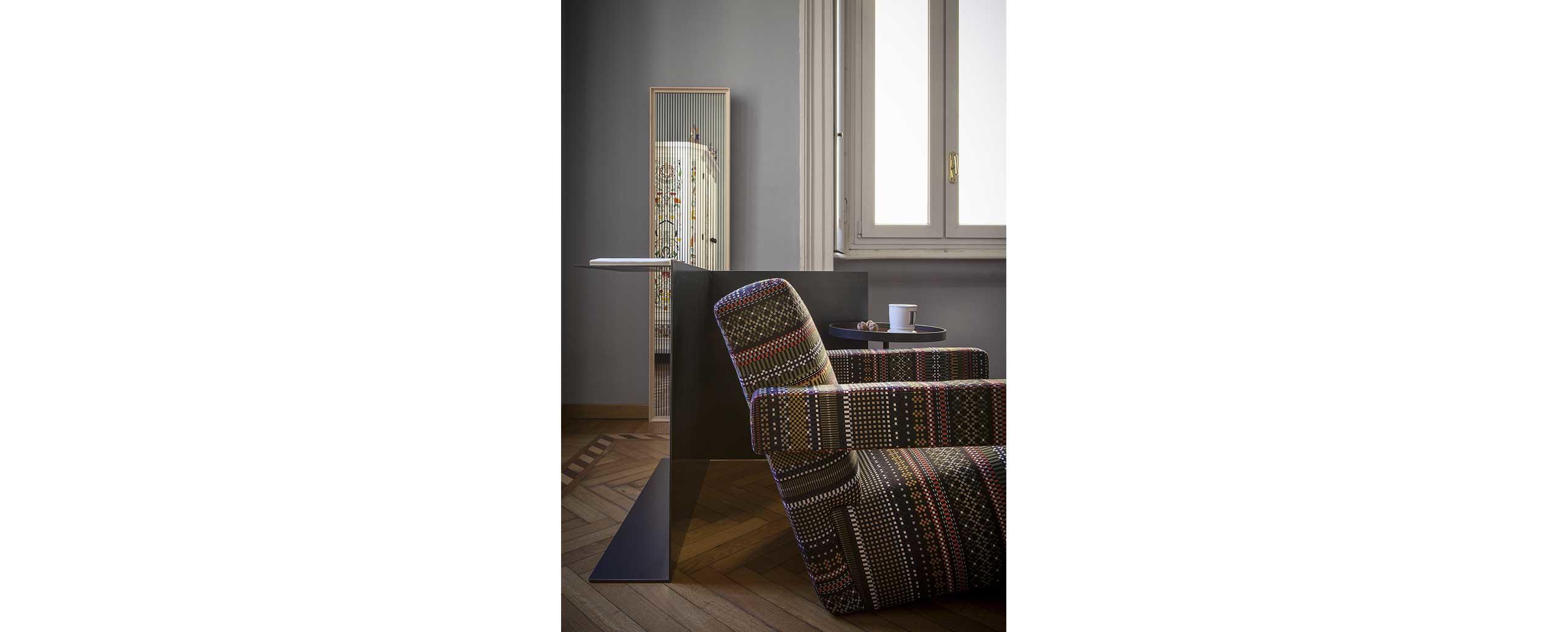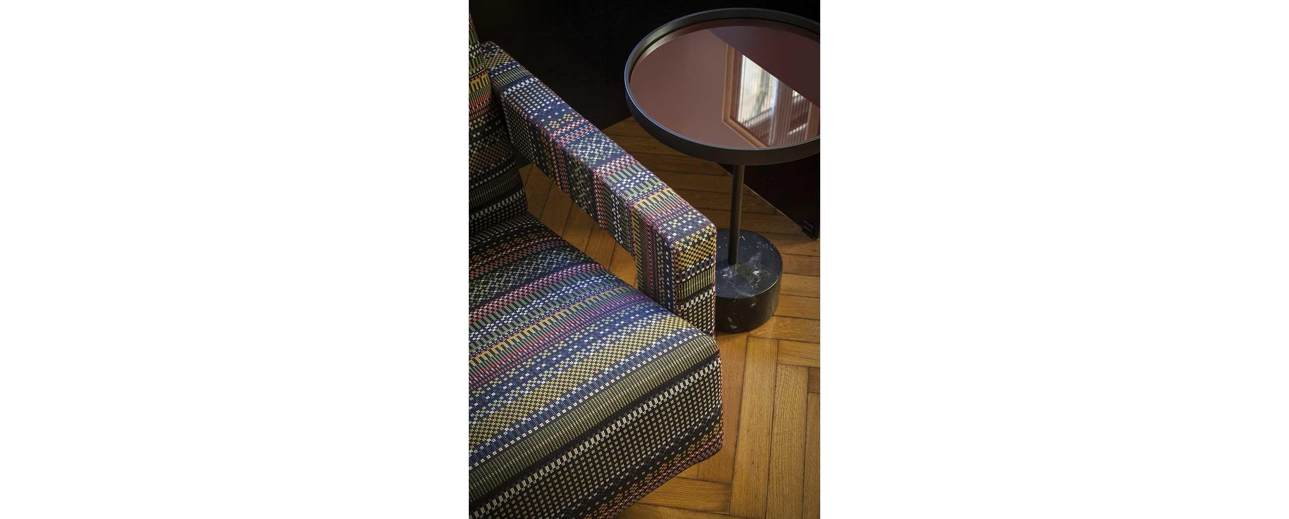 Point è un vivace tessuto che attraverso il rapporto e lo sviluppo dei colori proporzionati danno al tessuto ritmo e densità. Notevole per peso e tattilità, il tessuto è realizzato con fili fitti e semilucidi legati da sottilissimi fili di nylon, che danno vita a una struttura a griglia che ricorda il mezzopunto.