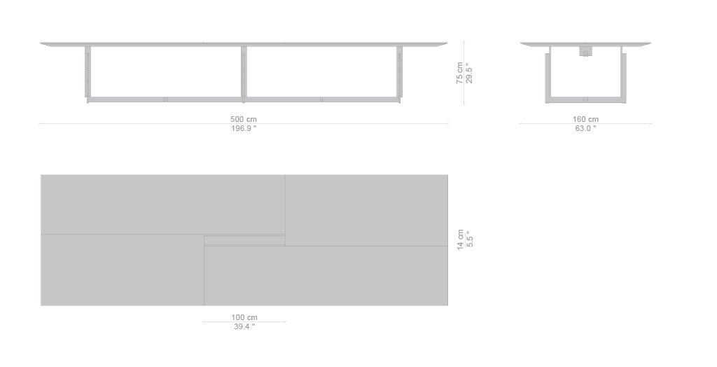 Collezione composta da tavoli rettangolari di diverse dimensioni, concepita per gli ambienti domestici e di lavoro. I tavoli sono caratterizzati da struttura in metallo trafilato satinato, protetta con vernice trasparente, collegata per mezzo di viti brunite a vista, piedini in materiale plastico di colore nero; i piani sono disponibili in due essenze, frassino tinto nero o noce canaletto, oppure in vetro retrolaccato verniciato nel colore bianco. I piani dei tavoli per ufficio, in entrambe le versioni, sono proposti con antina passacavi dotata di vaschetta contenitiva posta sotto il piano.
