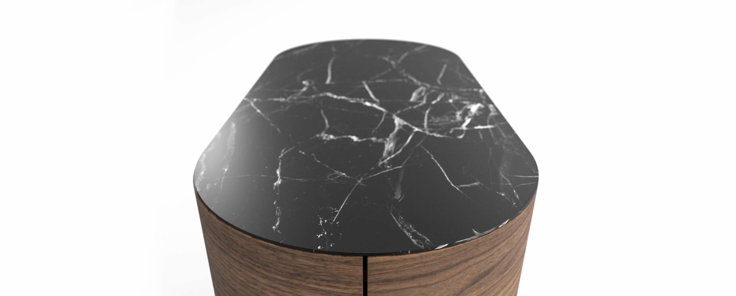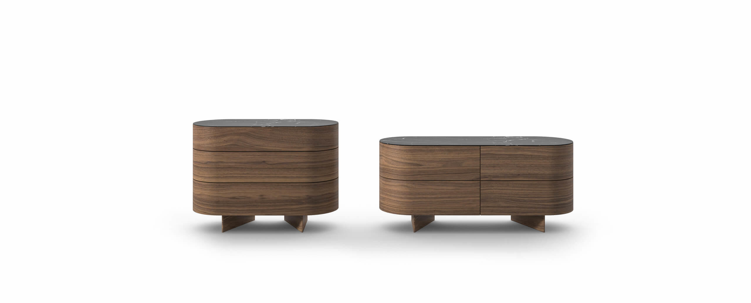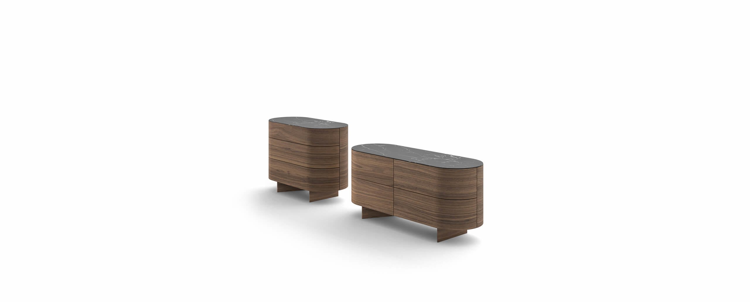 Il contenitore si caratterizza per le forme morbide e tondeggianti, che si abbinano al letto Bio-mbo e ai suoi comodini creando una zona notte accogliente e informale. La struttura e i piedi sono in legno curvato e impiallacciato in rovere tinto nero, noce canaletto o rovere amaranto; i cassetti in legno hanno apertura push pull e guida a chiusura rallentata, mentre il top è proposto in MDF impiallacciato nelle essenze della struttura o in marmo in tre varianti: Carrara, Marquina, Grigio Carnico. Rondos è disponibile in due dimensioni: con due coppie di cassettoni accostati o con tre cassetti sovrapposti.