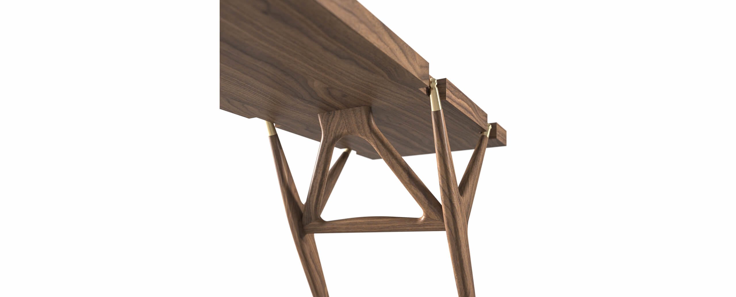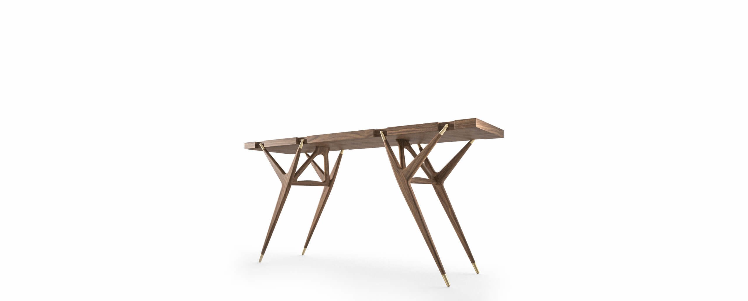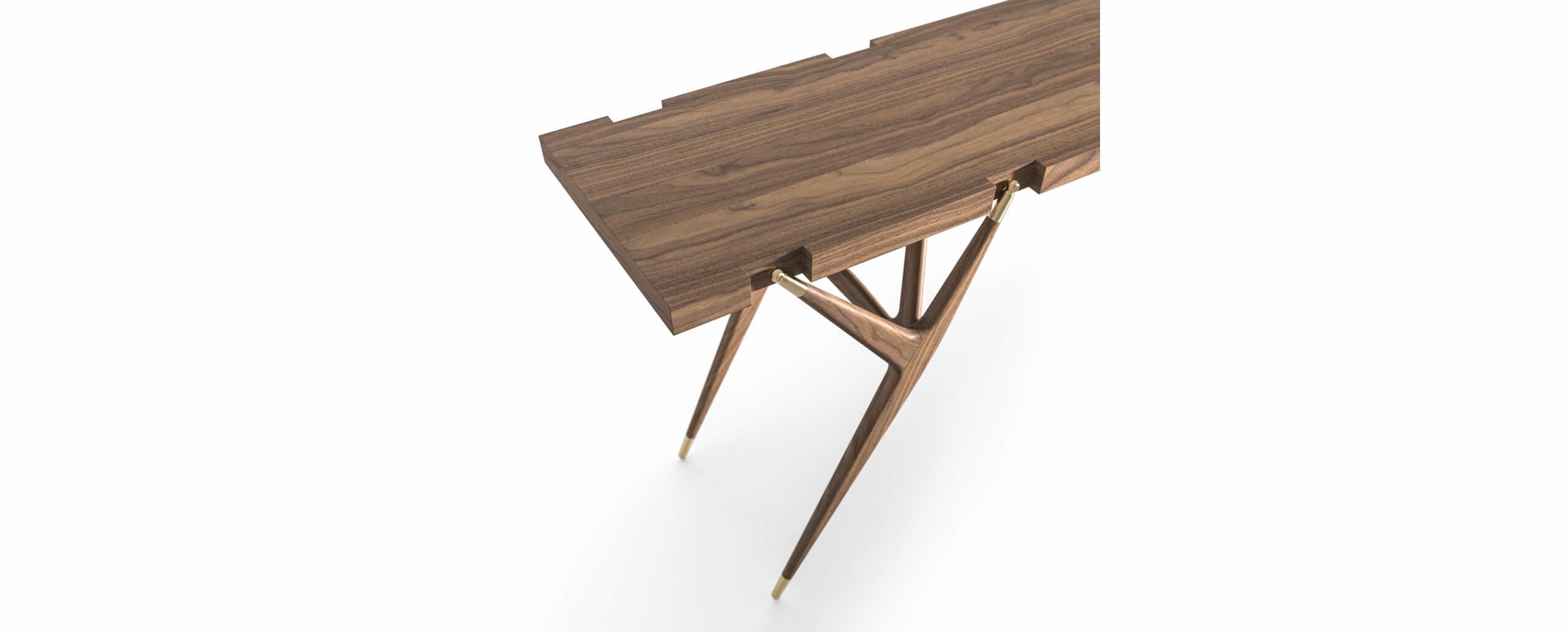 L’idea di questa consolle, disegnata da Ico Parisi nel 1947 per una committenza privata, nasce da poche linee tracciate di getto su un foglio: una retta orizzontale e due oblique a definire una strut-tura dalle proporzioni pressoché perfette e dall’aspetto organico. Cassina ha saputo rispettare e valorizzare il cuore di questo progetto unendo la tecnologia all’artigianalità, tipiche della fale-gnameria dell’azienda; il risultato è una raffinata consolle in legno massello impreziosita da det-tagli metallici che si adatta a tutti gli ambienti di casa. Il piano rettangolare presenta sui due lati maggiori, in prossimità degli estremi, quattro scassi a intaglio retto, entro i quali, come vere e proprie articolazioni, sono avvitati i puntali dei bracci superiori delle gambe dalla caratteristica forma a “Y” divergente, disponibili in Frassino o Noce Canaletto e vincolate a due a due mediante una traversa sagomata. L’equilibrio e la solidità sono garantiti da due elementi obliqui in legno massello tornito, uniti in diagonale alla traversina e incastrati nel sottopiano.
