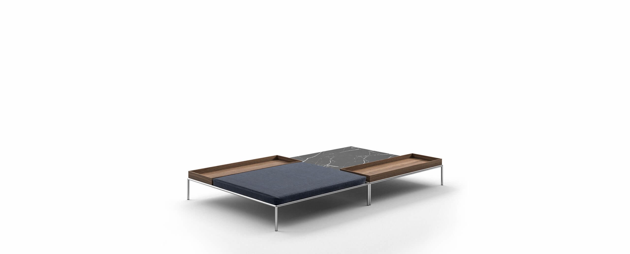 Modulare e versatile, grazie alla varietà di elementi e configurazioni disponibili, il siste-ma Mex-Hi è costituito da cinque pianali di diverse misure su cui fissare le cuscinature indipendenti – braccioli, schienali e sedili – per consentire la realizzazione di composi-zioni ad angolo, in linea o a isola. Grazie allo studio eseguito da Cassina LAB, una col-laborazione tra il Centro di Ricerche e Sviluppo di Cassina e il Poli.design del Politecni-co di Milano, il divano è realizzato con materiali innovativi al fine di renderlo comodo e più sensibile all’ambiente. Una fibra riciclata al 100%, ottenuta da PET in gran parte re-cuperato dagli oceani, è introdotta nell’imbottitura dei cuscini. La struttura è in tubolare di acciaio dotata di cinghiature elastiche; il rivestimento è sfoderabile. Completano la colle-zione un tavolino freestanding e un pouf/tavolino.