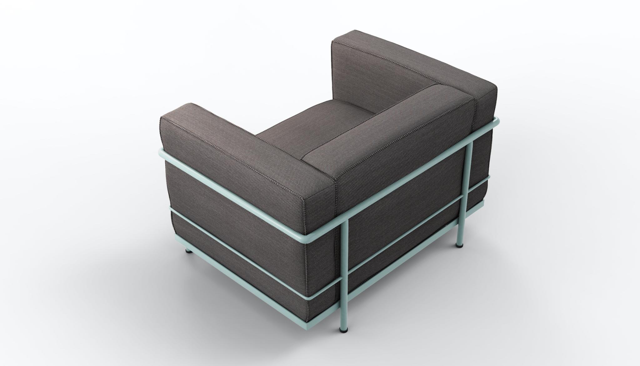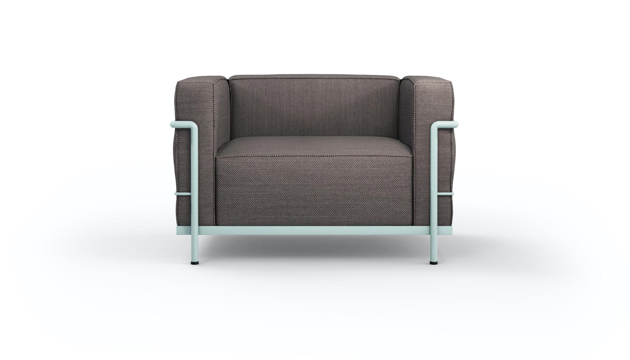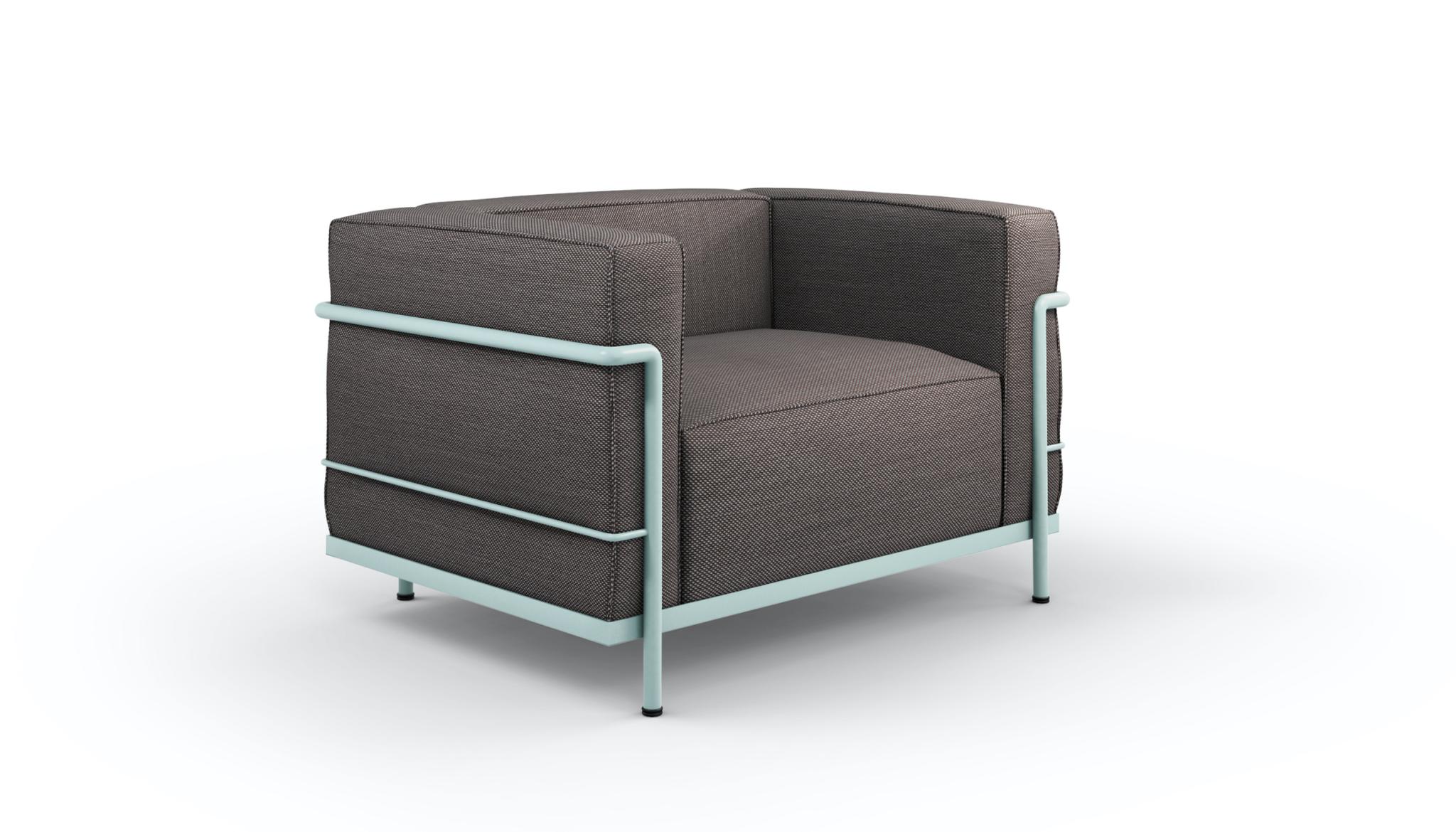 Fauteuil GrandConfort, grand modèle. Four loose cushions are set inside a painted or chrome-plated tubular steel cage that forms the primary support for this iconic armchair, the emblem of modernity itself. The LC23 two and three seatssofacompletes the family.