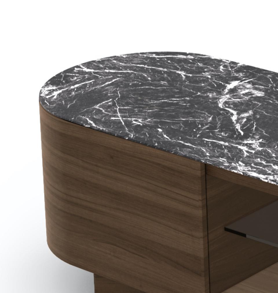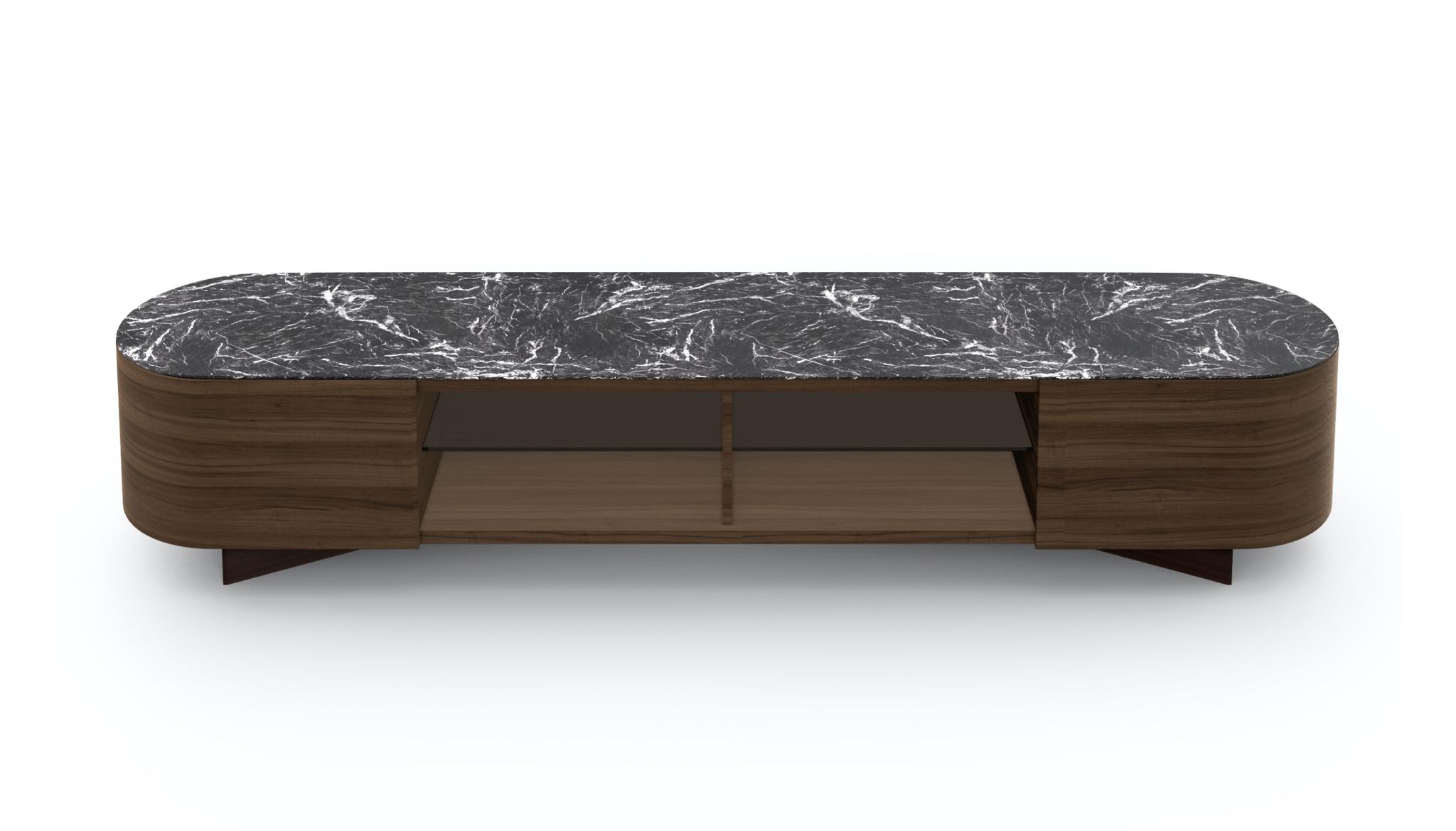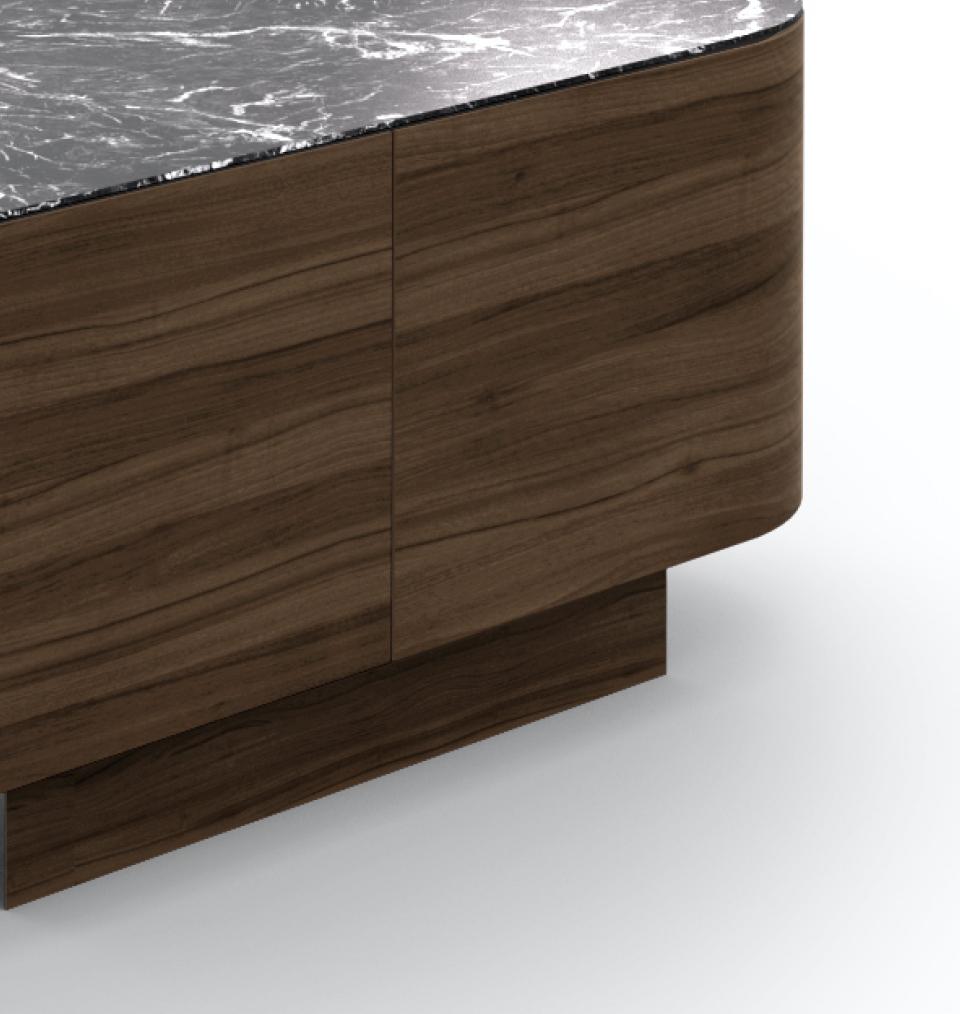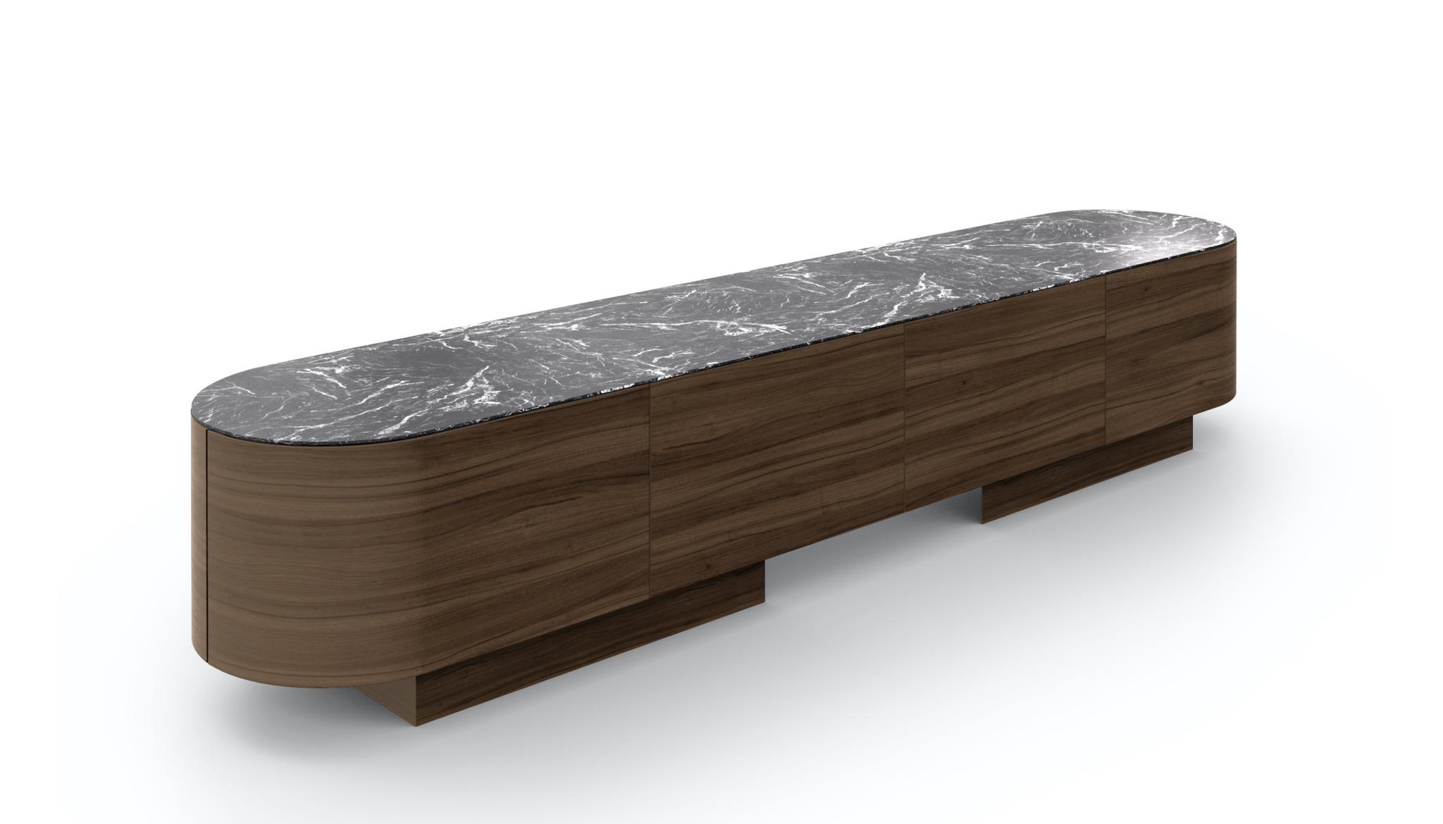 A sideboard characterised by the same soft and rounded shape as the model designed for the bedroom but, with a versatility of use that perfectly lends itself to the living room. Designed for a modern home, Rondos is available in two sizes with wooden push to open soft close drawers, or an open compartment with glass shelves and a false back in the central module for television cables to pass through.