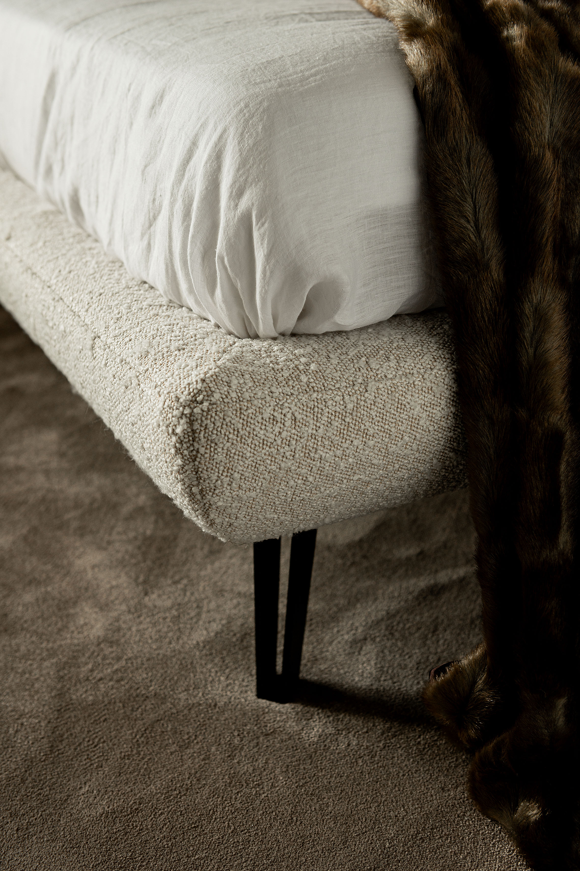 The raised bed frame is finished in fabric or leather like the headboard and supported by metal feet. There is a pleasing contrast between the rounded corners of the upholstery and the square shape of the metal feet, which have a central slit.The result is a sophisticated modern double bed that combines aesthetic elegance and design quality to perfection.