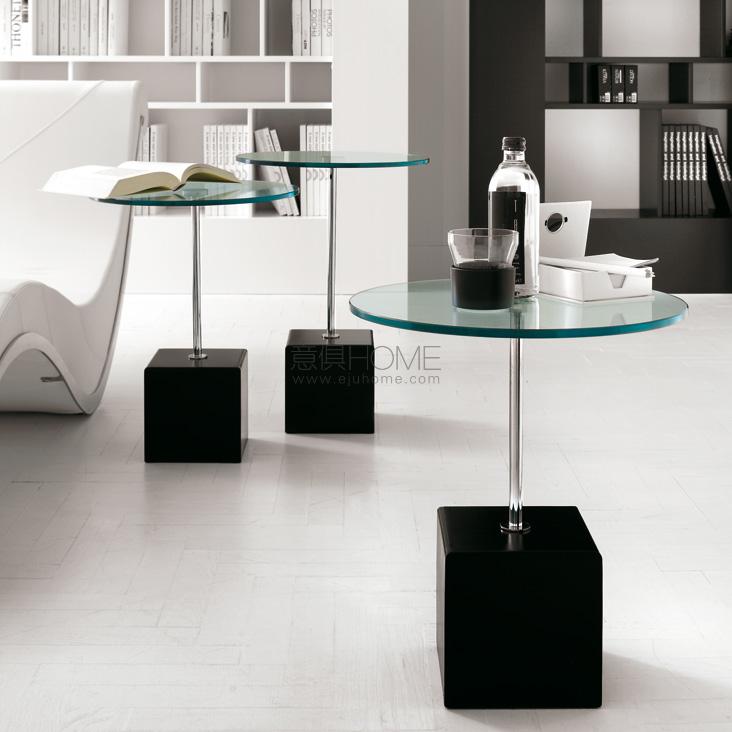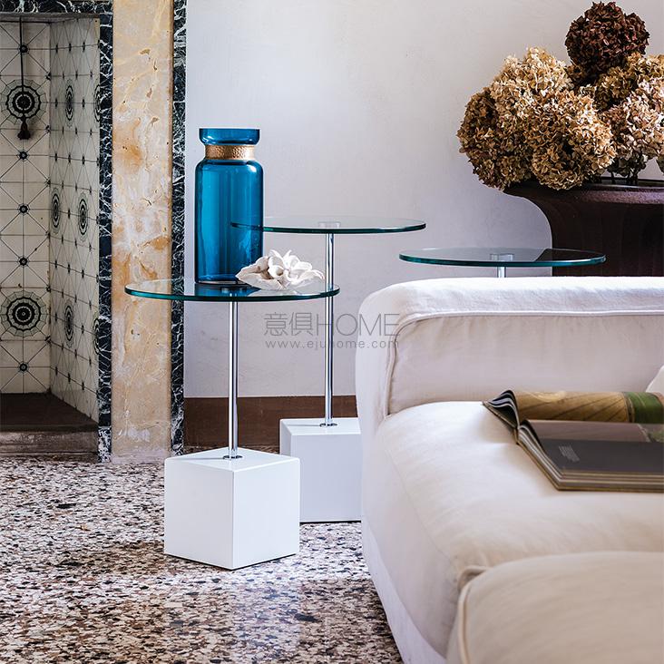 Coffee table with base in white (OP71) or black (OP17) painted steel, chromed (08) stem and top in tempered clear glass.