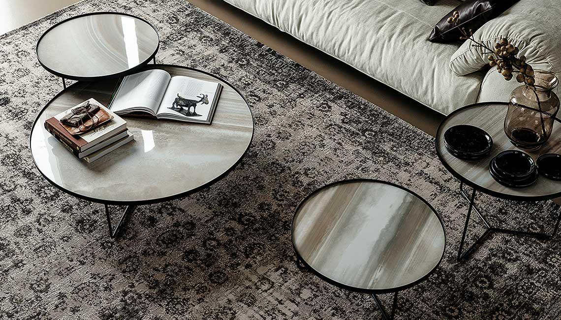 Coffee table with frame in embossed titanium (GFM11) or black (GFM73) lacquered steel, or with base in Bronze and Brushed Bronze top frame. Marmi Calacatta (KM01), Alabastro (KM02), Ardesia (KM04), matt Portoro (KM07), glossy Portoro (KM08), Emperador (KM10), Makalu (KM11), Arenal (KM13) or Zefiro (KZ20) ceramic top.