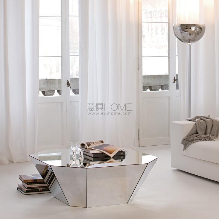 Coffee table completely covered in mirrored glass or smoke-grey mirrored glass.