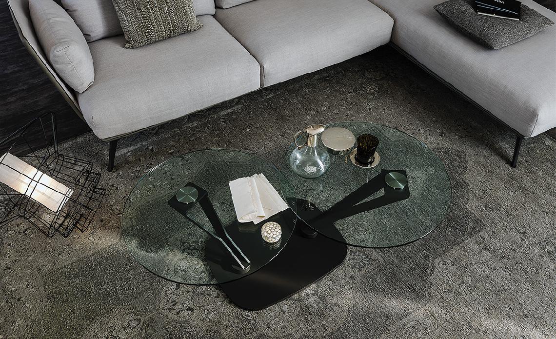 Coffee table with base in graphite (GFM69) embossed lacquered steel. One or two swiveling clear or fumé glass tops.