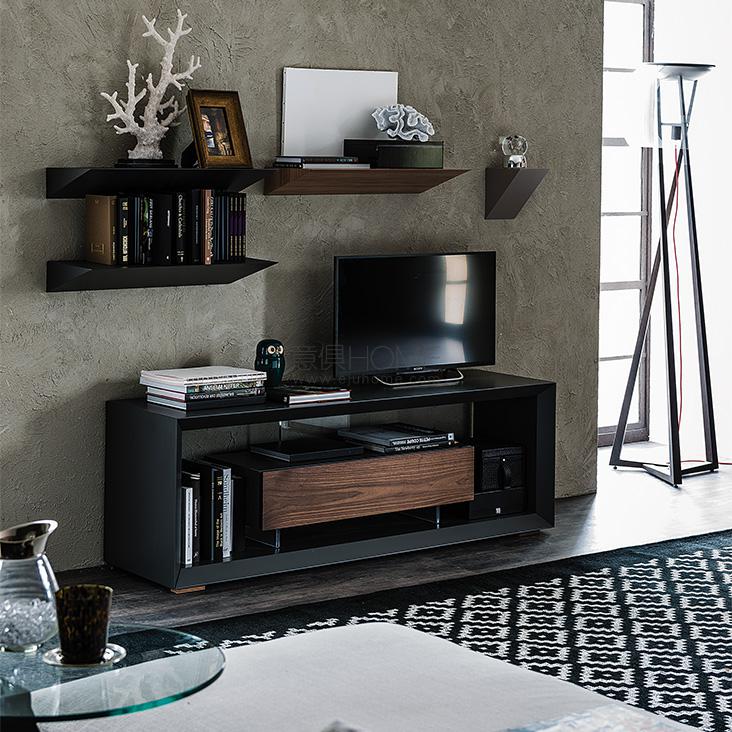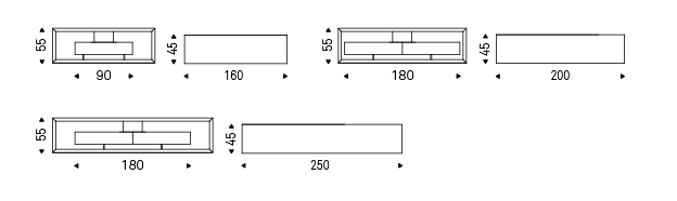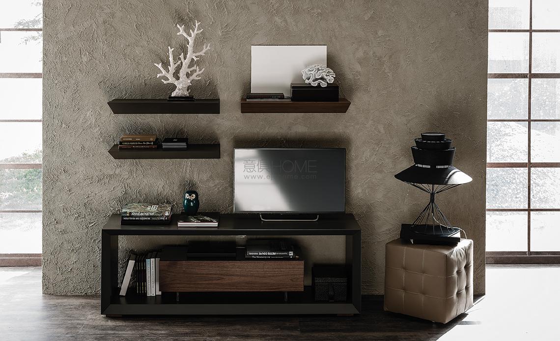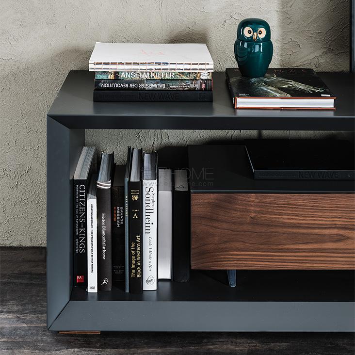 TV cabinet with graphite (GF69) or white (GF71) embossed lacquered frame. Canaletto walnut (NC), white (GF71) or graphite (GF69) embossed lacquered drawer unit and doors. 160cm version with flap door, 200cm and 250cm versions with flap door (L) and drawer (R).