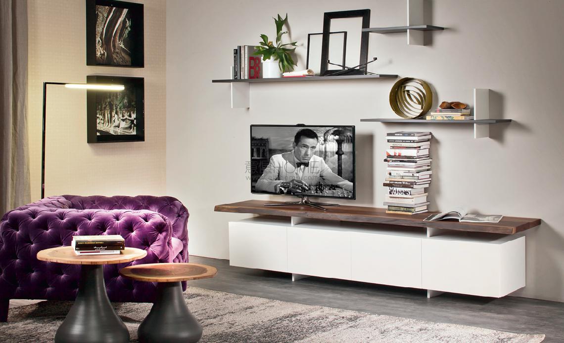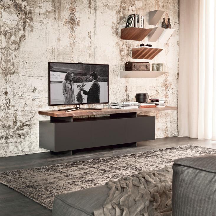 TV cabinet with 3 or 4 wooden doors painted in matt white (OP7) or graphite (OP69). Top in the same color of the frame or in solid Canaletto walnut (NC), burned oak (RB) or natural oak (RN) with irregular edges.
