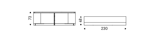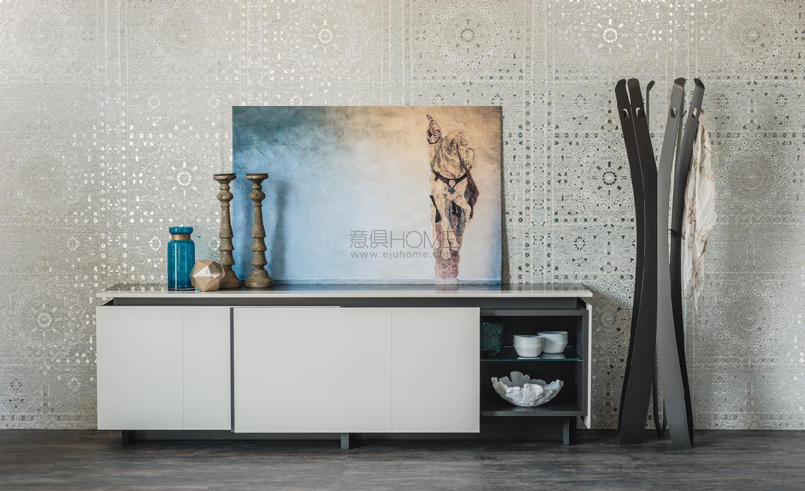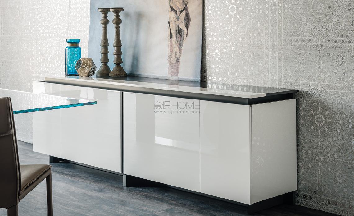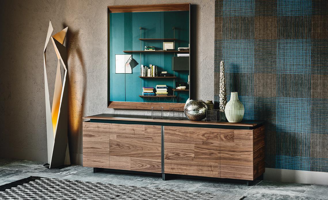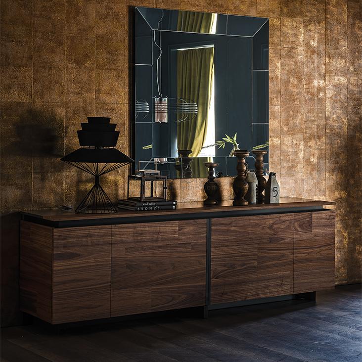 Sideboard with sliding doors in Canaletto walnut (NC) and structure in matt graphite (OP69). Internal shelves in clear glass.