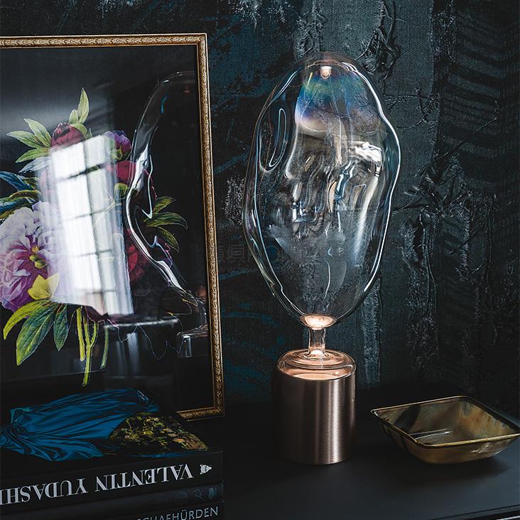 Ceiling or table lamp. Table lamp with lampshade in Iride glass and satin Nickel base. Ceiling lamp with lampshade in Iride glass or smoked grey glass. S1: single plate. S2/6: round ceiling plate for 2/6 lampshades. S7/12: round ceiling plate for 7/12 lampshades. Bulb included.