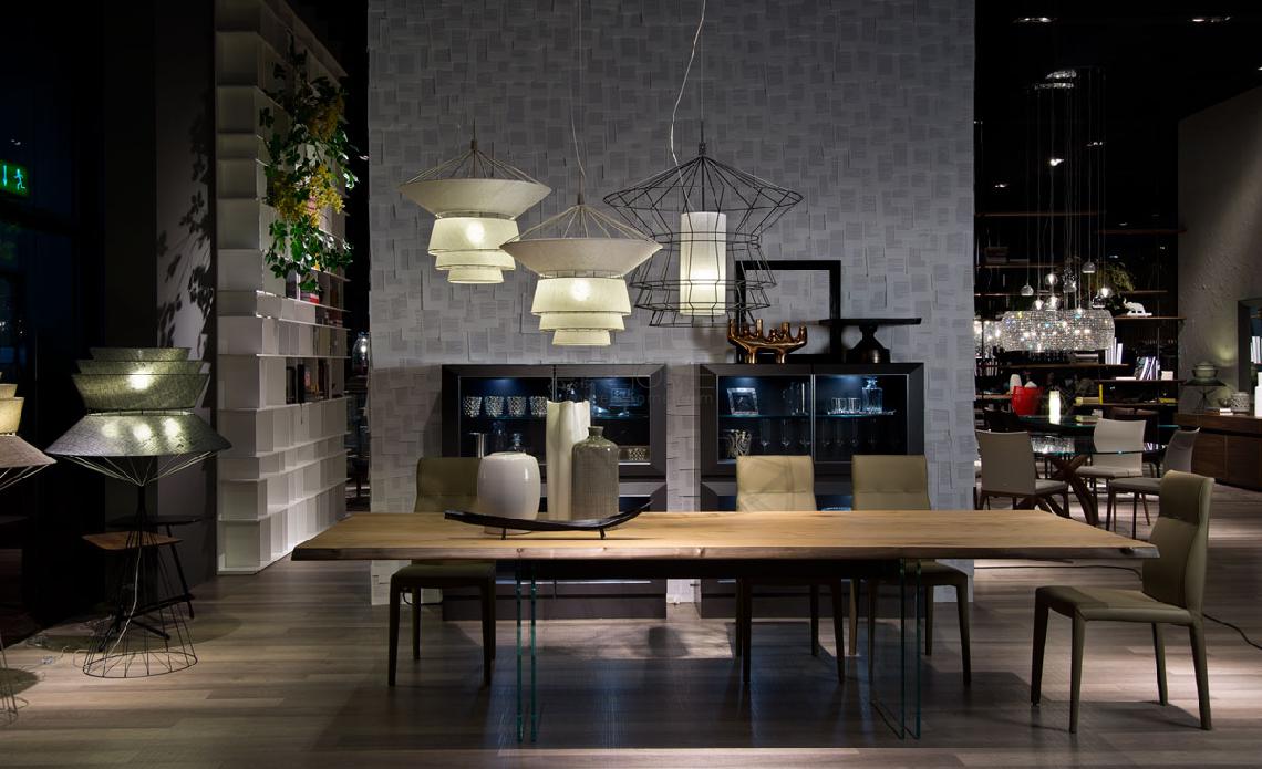 Ceiling or floor lamp with steel frame in matt black painted (OP17) or Nickel. Ivory, brown or black covering fabric. Bulb not included.