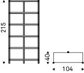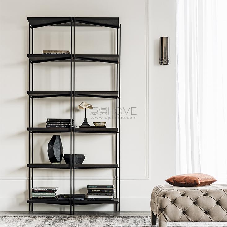 Modular bookcase with frame in titanium (GFM11), graphite (GFM69), white (GFM71) or black (GFM73) embossed lacquered steel. Shelves in Canaletto walnut (NC) or burned oak (RB) or embossed graphite (GF69) or white (GF71) painted wood. Satin bronze laquered steel details. For the freestanding use at least two modules are recommended.