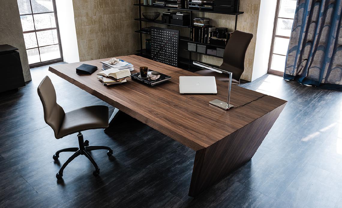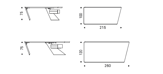 Desk with drawers in Canaletto walnut (NC), Heritage oak (HR) or open pore matt black (OLM73) Elm. Leg in graphite (GFM69) embossed lacquered steel. On version 215x100 the drawer can be fixed on both sides of the desk, on version 260x120 it can be fixed only facing the shortest side.