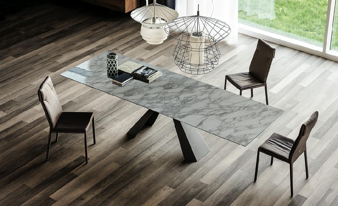 Extendible table with base in titanium (GFM11), bronze (GFM18), graphite (GFM69), white (GFM71) or black (GFM73) embossed lacquered steel. Marmi ceramic top and extensions in Calacatta (KM01), Alabastro (KM02), Ardesia (KM04), matt Golden Calacatta (KM05), glossy Golden Calacatta (KM06), matt Portoro (KM07), glossy Portoro (KM08), glossy Sahara Noir (KM09), Emperador (KM10), Makalu (KM11), Breccia (KM12) or Arenal (KM13).