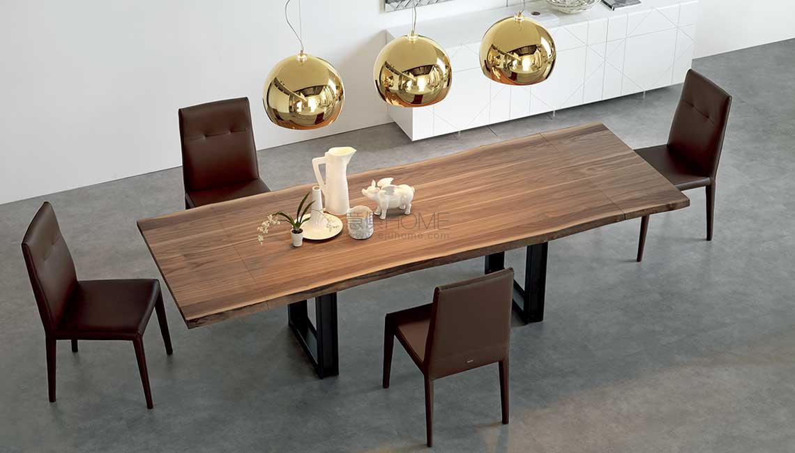 Extendible table with transparent varnished metal (OP0) base. Top and extensions in Canaletto walnut (NC), burned oak (RB) or natural oak (RN) with solid irregular edges. The finish of the base OP0 identifies a transparent coating on ferrous raw material. The presence of more or less obvious stains, colour variations, scratches and irregular edges is feature of the special material processing and should not be considered a defect.