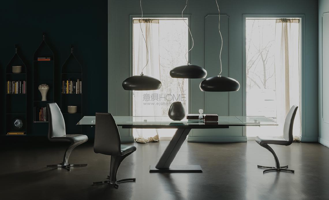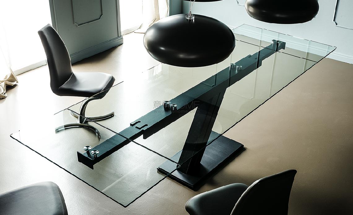 Extendible table with base and rail in graphite (GFM69) or black (GFM73) embossed lacquered steel. Top and extensions in 12mm clear, extra clear or smoked tempered glass.
