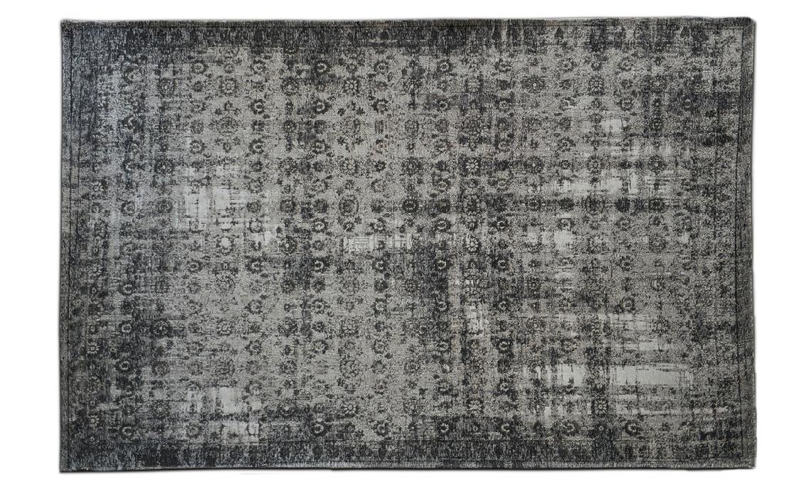 Rug made in cotton and chenille with relief and with a faded and used appearance.