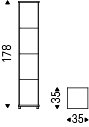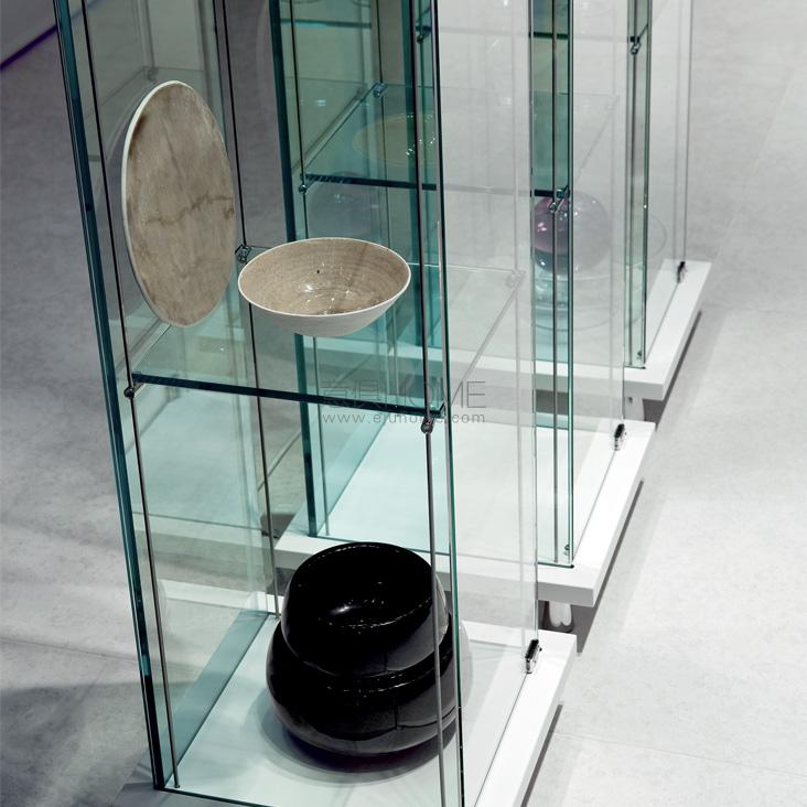 Clear glass showcase with top and bottom in Canaletto walnut (NC) or white (OP7) stained beechwood. Chromed (08) steel feet. With led light. Max capacity: each shelf kg 7.