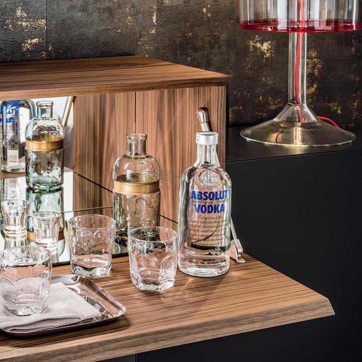 Bar unit in Canaletto walnut (NC) and matt graphite (OP69) painted wood with mirrored internal frame and glass holder. Base in graphite (GFM69) embossed lacquered steel. LED light. Wall anchorage is required.