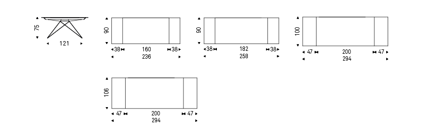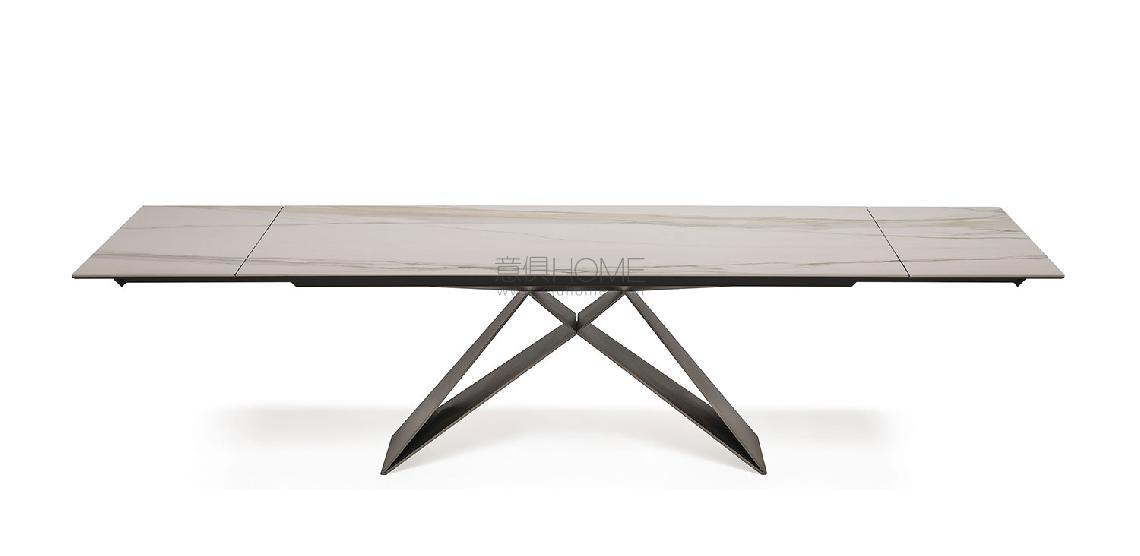 Extendible table with base in titanium (GFM11), bronze (GFM18), graphite (GFM69) or black (GFM73) embossed lacquered steel. Marmi ceramic in Calacatta (KM01), Alabastro (KM02), Ardesia (KM04), matt Golden Calacatta (KM05), glossy Golden Calacatta (KM06), matt Portoro (KM07), glossy Portoro (KM08), glossy Sahara Noir (KM09), Emperador (KM10), Makalu (KM11), Breccia (KM12) or Arenal (KM13) ceramic top.