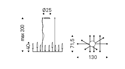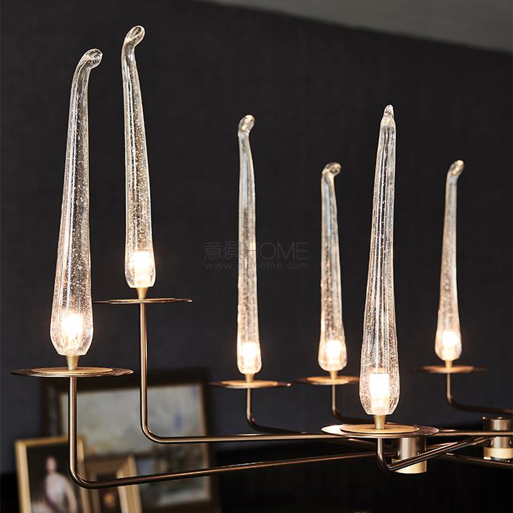 Ceiling lamp in bronze embossed lacquered steel and brass inserts. Candle shape elements in handmade pulegoso Murano glass. Downward and upward led lighting. Every glass element is unique and different in size and shape. Bulb included.