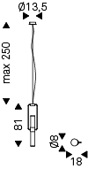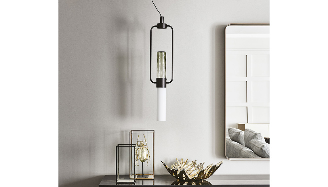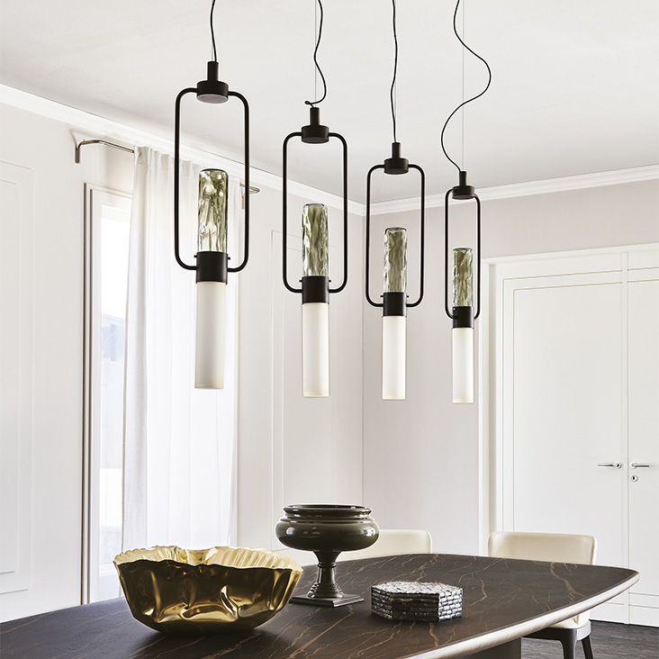 Ceiling lamp with frame in burnished steel, lampshade in blown fumé glass and blown satin white glass. Integrated LED light.