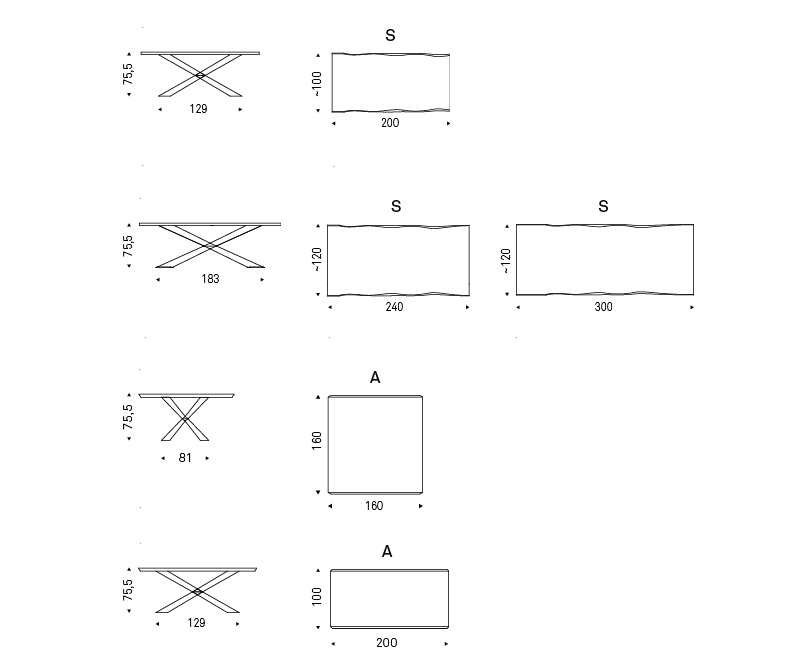 Table with base in matt black (OP17), graphite (OP69) or white (OP71) painted steel, or in weathered brass or polished stainless steel, or in satin bronze (15), satin titanium (11) painted steel, or with wooden base in Canaletto walnut (NC), dark Wenghè (W2) or Heritage oak (HR). Top "S" version 4cm thick with irregular solid wood edges in Canaletto walnut (NC), burned oak (RB) or natural oak (RN). Small reflection irregularities on the stainless steel base or glazes on the satin titanium or satin bronze painted base are due to handmade processing.