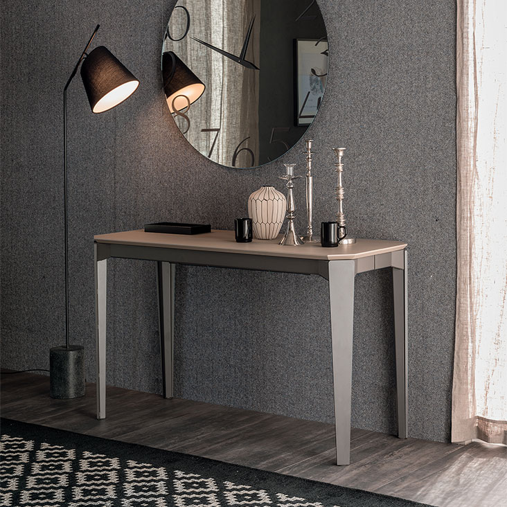 Extendible console with base in graphite (GFM69) or white (GFM71) embossed lacquered steel. Top and extensions in white climb (LM02), grey oxide (LM06), walnut (LM05), grey London Fenix (LM21) or castoro Ottawa Fenix (LM22) laminated wood. Bag for extentions incuded.