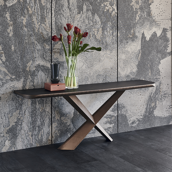 Console with base in titanium (GFM11), bronze (GFM18), graphite (GFM69) or black (GFM73) embossed lacquered steel, Brushed Bronze or Brushed Grey. Top in Canaletto walnut (NC) with Brushed Grey lacquered and rounded lower profile or elm open pore matt black (OLM73) with Brushed Bronze lacquered and rounded lower profile. Wall anchorage is necessary.